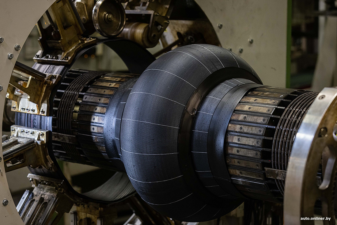 Когда все составные части шины готовы, они отправляются на сборку. Этот процесс полностью автоматизированный и «залипательный». Отдельно изготавливается каркас, которому придается форма профиля. Отдельно — брекерный пакет. Затем и то и то соединяется в «сырую» шину. Все это происходит примерно за 30 секунд.