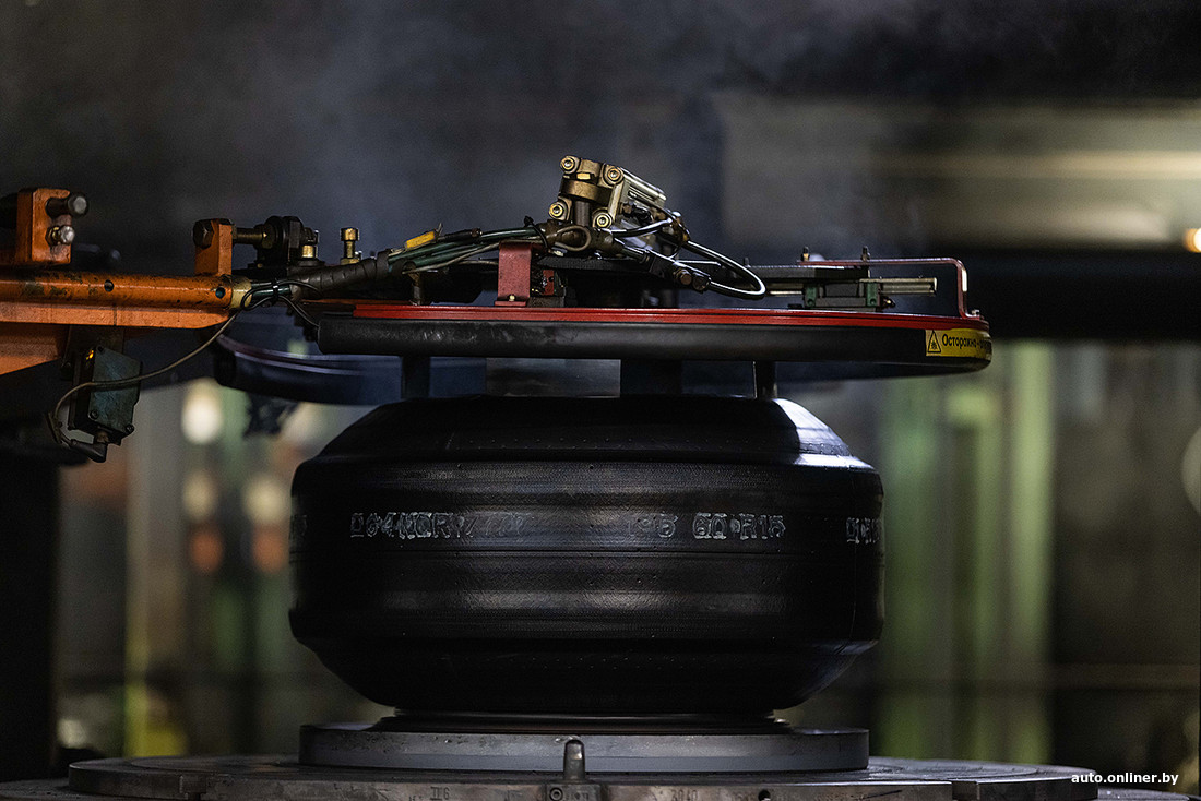 Со стороны кажется, что происходит магия: валит пар (180 градусов по Цельсию), на заготовку давит пресс-форма, и появляется шина с протектором, боковиной и другими важными атрибутами (минут через 10). Правда, близко подходить к оборудованию нельзя, приходится наблюдать со стороны.