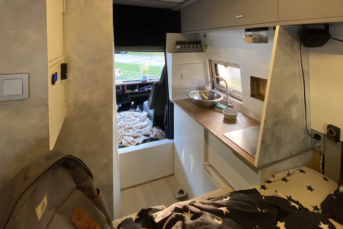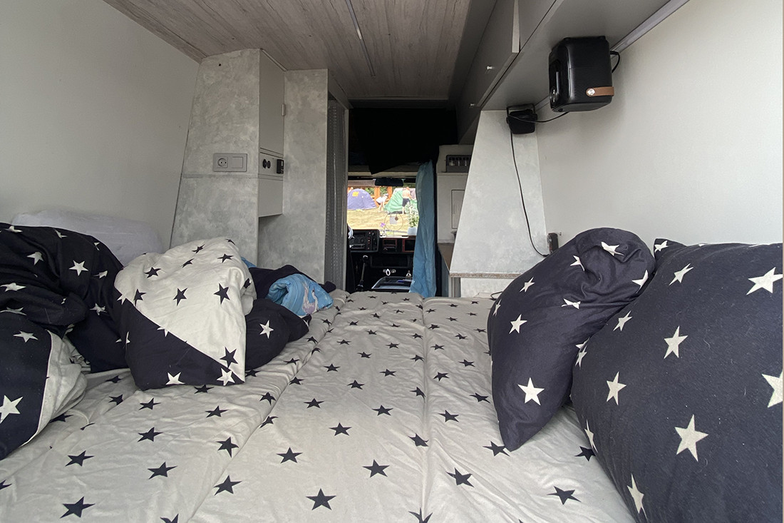 Внутри, сразу за водительским сиденьем, душ со шторкой. Напротив расположена кухня. Владелец подсказал, что нишу над водительским местом можно использовать как для хранения вещей, так и в качестве спального места (подойдет скорее для детей). За кухней — сложенная кровать и лавочка. Места предусмотрено немного, но все очень продуманно и, пожалуй, даже мило. Под самым потолком — проектор и две колонки. Прекрасный бонус для любителей засыпать под кинцо. Как видно на фото, в кемпере достаточно мест хранения, чтобы захватить с собой все свои пожитки.