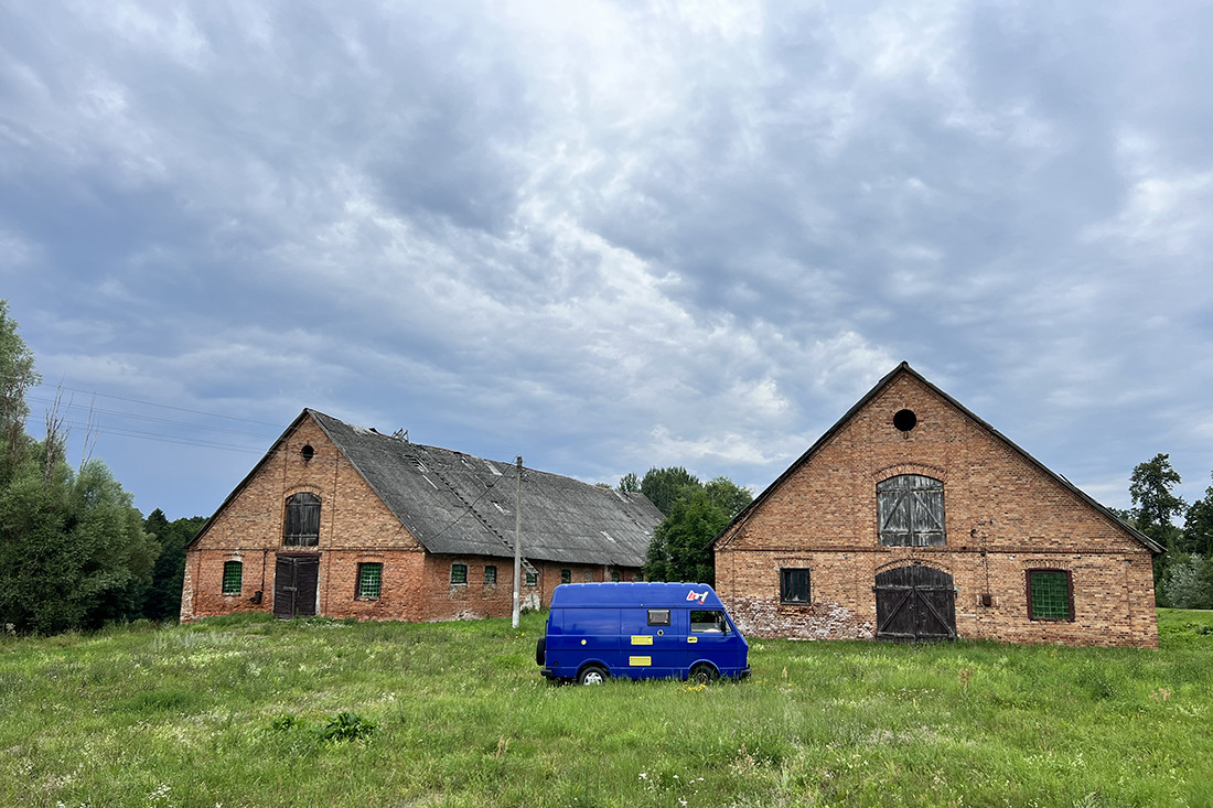 Пора выдвигаться в сторону экотропы «Голубые озера». По навигатору — полтора часа, но с нашим неспешным ходом будет все два. В полях встречаем какое-то невероятное количество аистов, один никак не хотел уходить с дороги: большие машины для него не повод менять привычный уклад. Как и планировали, останавливаемся рядом с каждыми достопримечательностями, что заметим. Идеальное место для фотосета — руины винокурни и хозпостроек усадьбы Богдановичей.