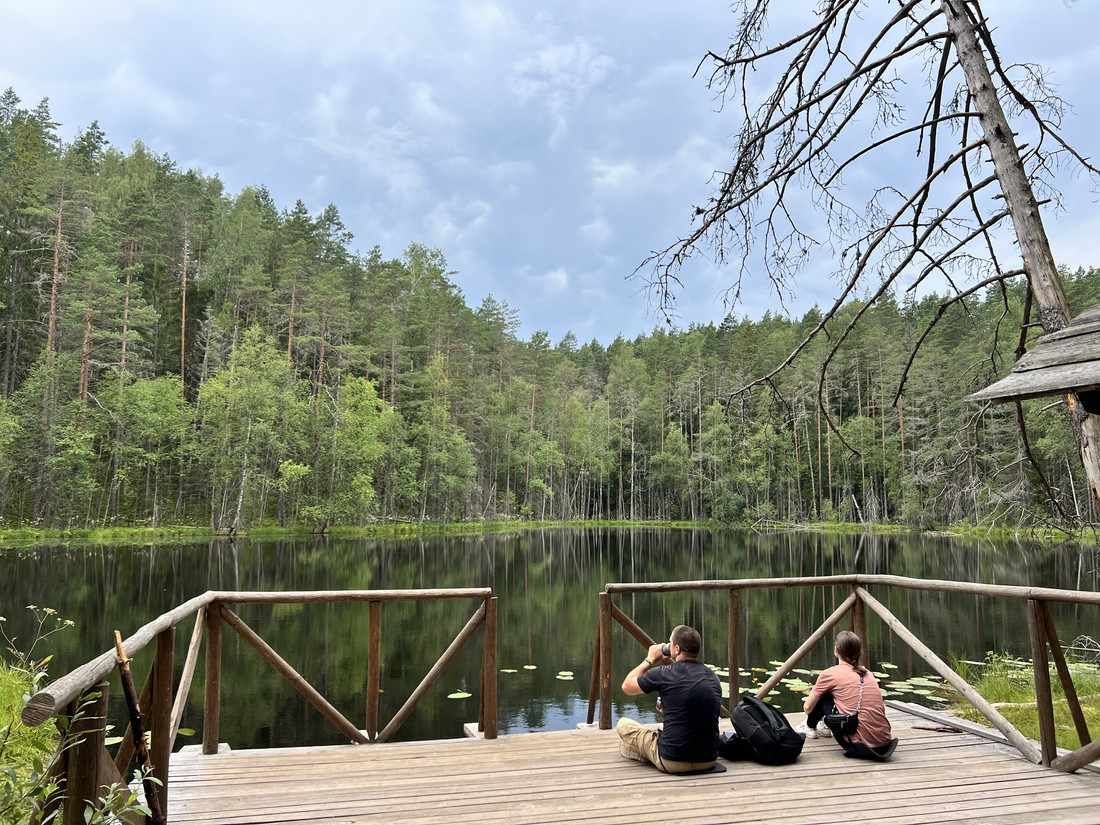 Сама экотропа находится в национальном Нарочанском парке. Вдоль тропинок висит несколько табличек с предупреждениями: нельзя сходить с протоптанных дорожек. Сюда приезжают покататься на велосипедах, покупаться или порыбачить, а можно и просто погулять (как раз наш вариант). На стендах-картах обозначены тропинки, оборудованный пляж и пусть к нему. Из трех маршрутов протяженностью четыре, семь и одиннадцать километров выбираем самый короткий. И спешим к красивому лесному озеру.