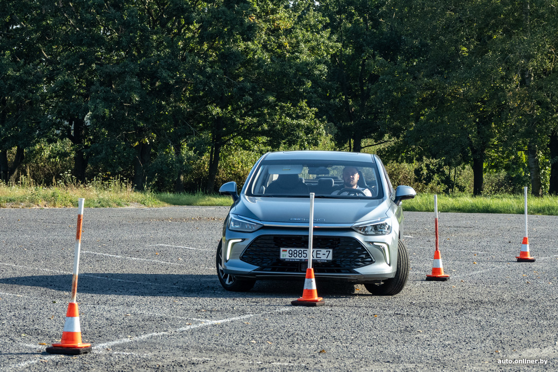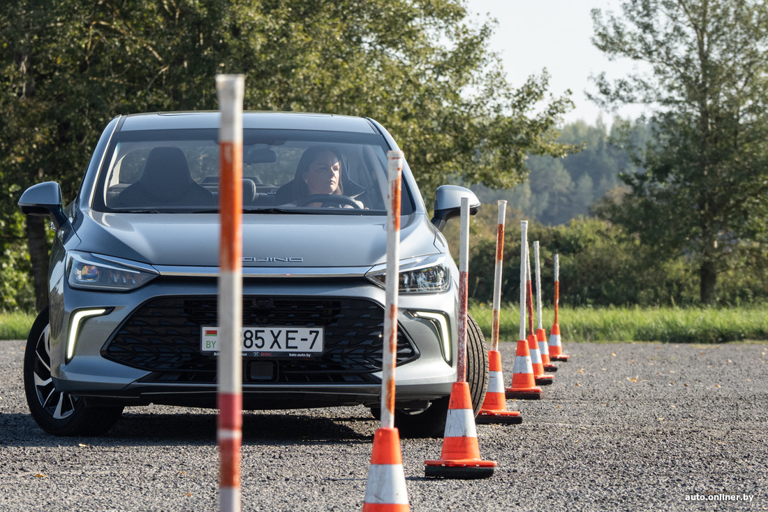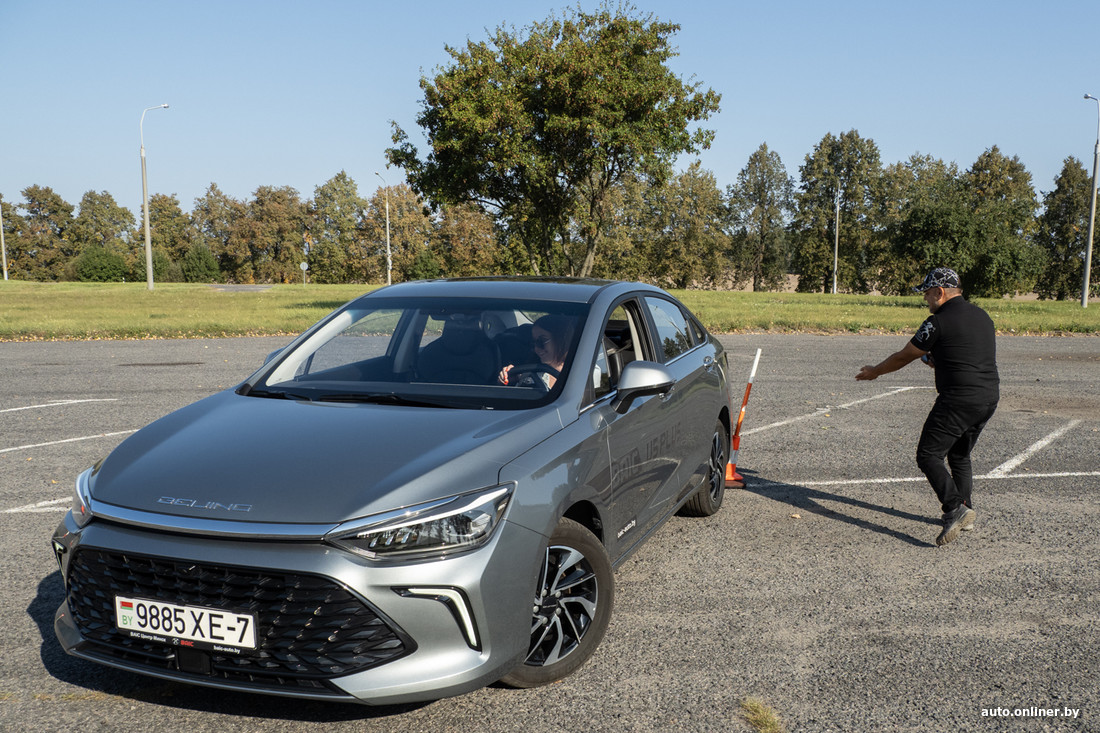 Парень садится за руль, его первая попытка. Пытается разогнаться, но быстро понимает, что на такой скорости не сможет держать нужную траекторию. Задевает один столбик, доезжает до конца и начинает движение задним ходом. Неудача! Почти всякий раз перед проездом «ворот» приходится останавливаться и отъезжать вперед, чтобы поправить траекторию. Что это: волнение, знакомство с автомобилем, тактика?