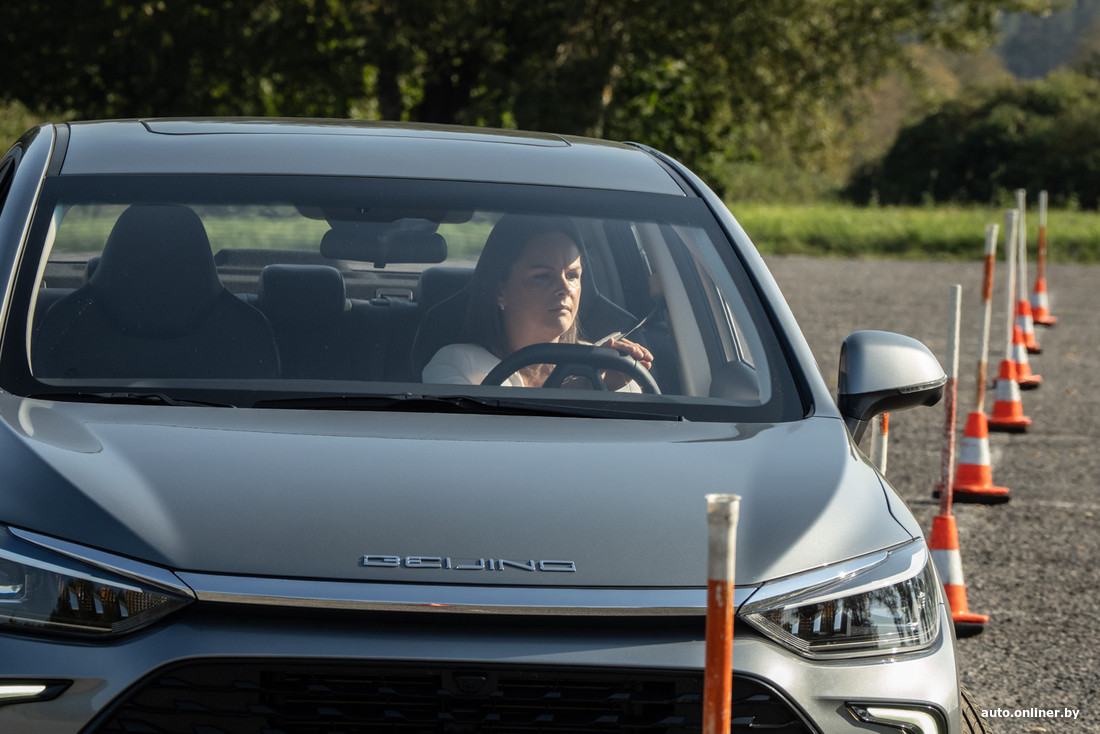 Второй садится за руль Виктория. Первая попытка очень хорошая, но явно не быстрая: девушка аккуратно выбирала траекторию, но ехала гораздо шире, чем показывал Краснов. В следующем заезде она попыталась ускориться, в итоге посыпались ошибки: дважды задела столбик. Третья попытка — ва-банк: снова быстро, снова с двумя штрафами. Лучшее время — 1 минута 44 секунды при двух штрафах.