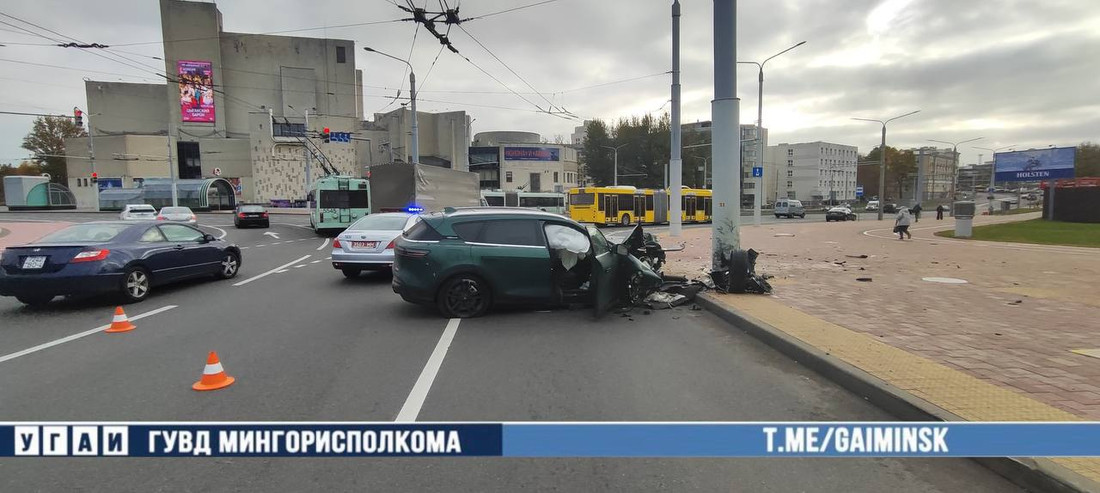 — Сегодня около 09:50 37-летний водитель Voyah, двигаясь в районе площади Богушевича, не справился с управлением и совершил столкновение с осветительной мачтой, — прокомментировали аварию в ГАИ.