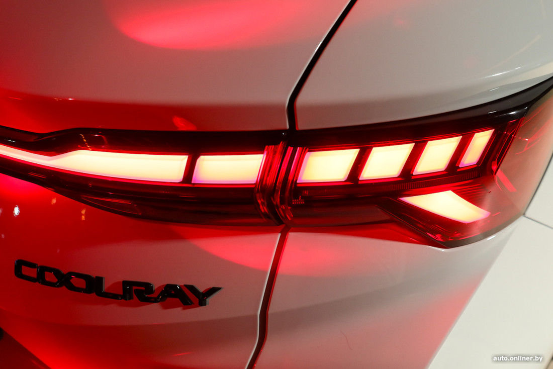 Фары стали ýже, а под радиаторной решеткой в переднем бампере появился огромный «щит», по углам которого расположились светодиодные ходовые огни. Задние фонари также изменили форму и рисунок, к тому же они теперь объединены при помощи световой балки. Ну а сбоку новый Coolray можно опознать по характерным накладкам на задних стойках, которые выполняют роль заглушек — окошек, как в прежней версии или X50, больше нет.