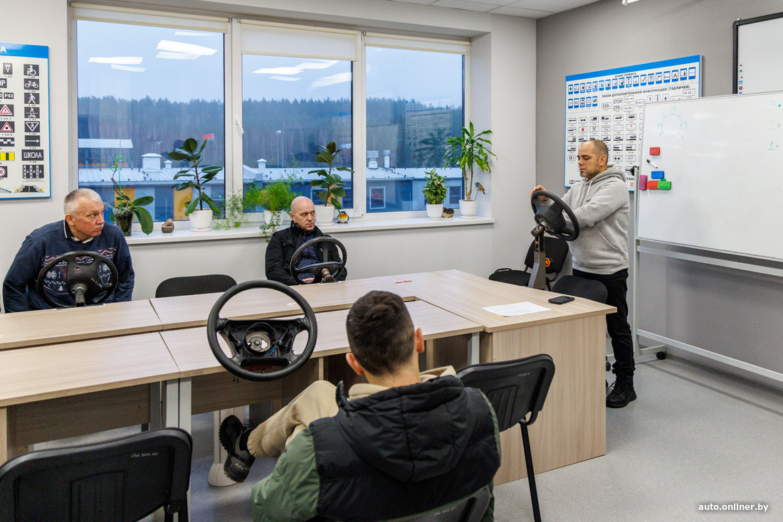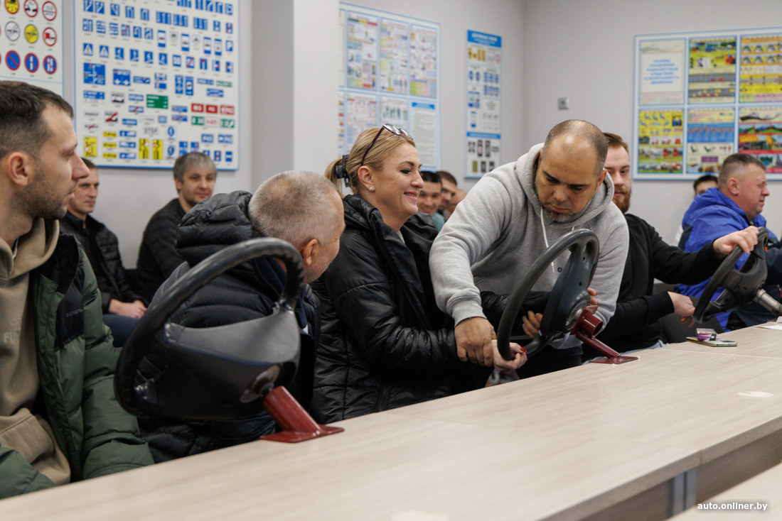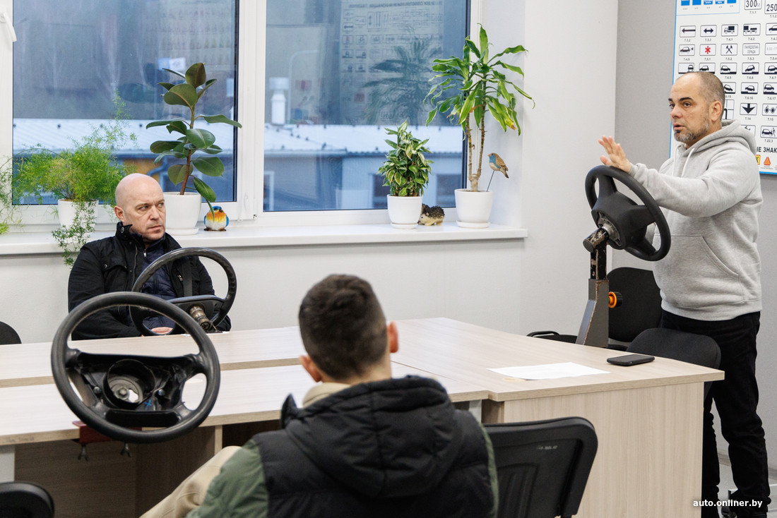 Интересно наблюдать, как взрослые дядьки садятся за парту крутить тренажер, будучи уверенными, что у них все получится. Краснов показывает, как нужно крутить, — и у дядек не получается. Нужна хорошая координация, нужно отлично владеть своими руками. Думаете, это так просто? Дядьки, которые тоже так думали, начинают смущенно улыбаться, чуть качают головой. Улыбка сменяется удивлением: что это, руки не слушаются? Самые упорные продолжают крутить руль по-своему, так, как получается, — не хотят учиться, но и неумеками выглядеть не хотят. В общем, стандартный класс с успевающими и неуспевающими, с прилежными учениками и тем, кому все равно.