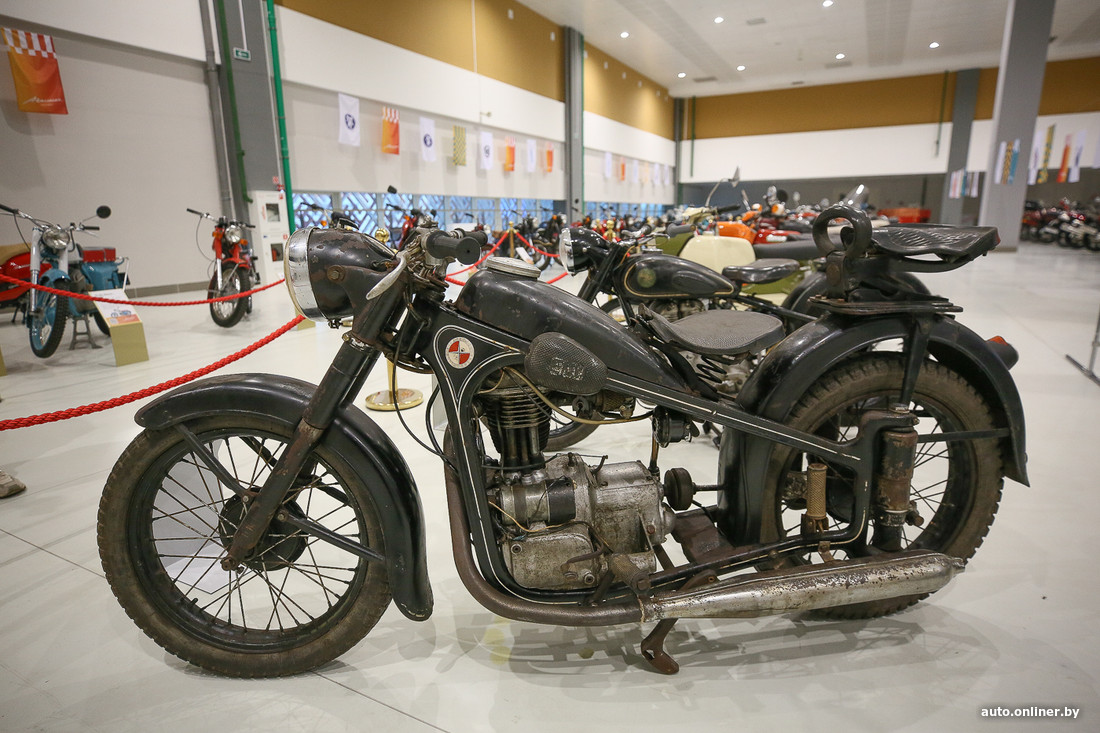 Перемещаемся на второй этаж выставки — к мотоциклам. Тут на одной площадке собрана как советская техника, так и более современные «немцы», «японцы», «итальянцы» и не только. Хранителю коллекции трудно было выделить самые интересные экспонаты, поэтому начнем с наиболее возрастных и редких.