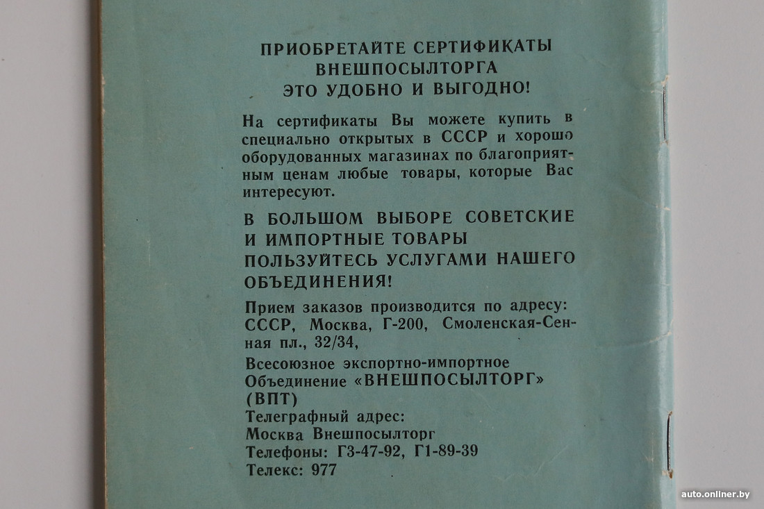 Стоит пояснить, что Всесоюзное экспортно-импортное объединение «Внешпосылторг» продавало товары в розницу и мелкооптовыми партиями советским гражданам, посольствам, миссиям и другим иностранным организациям и их сотрудникам, находящимся в СССР и в других странах, а также отельным иностранным гражданам.