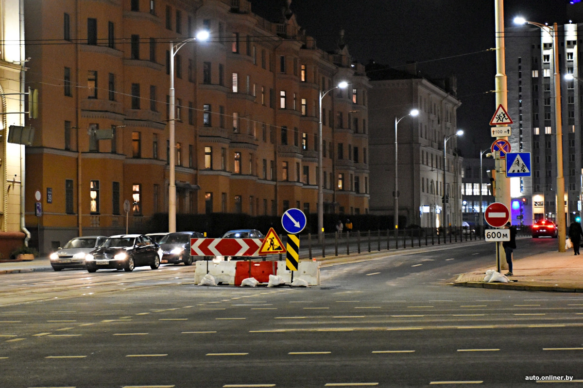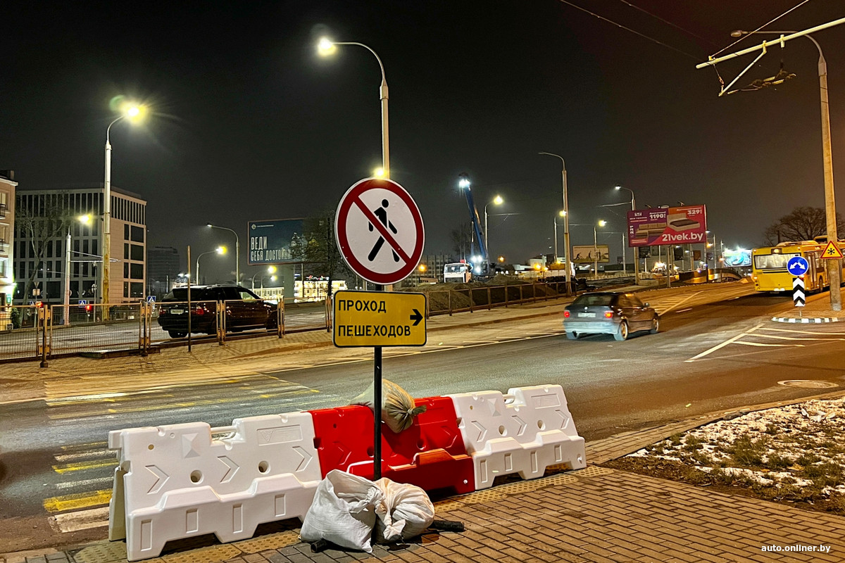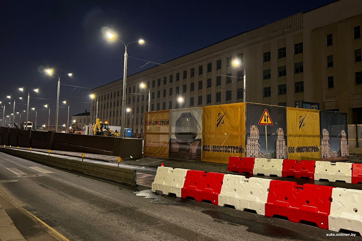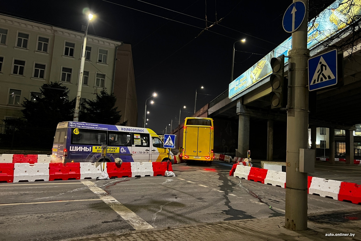 Для всех транспортных средств закрыт сам путепровод и короткий отрезок ул. Бобруйской прямо под ним — работы на объекте уже ведутся. Объезд для маршрутных транспортных средств организован через площадь Независимости — напротив главного корпуса БГУ построена временная круговая развязка.