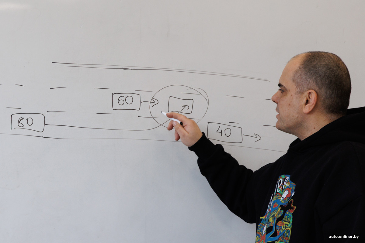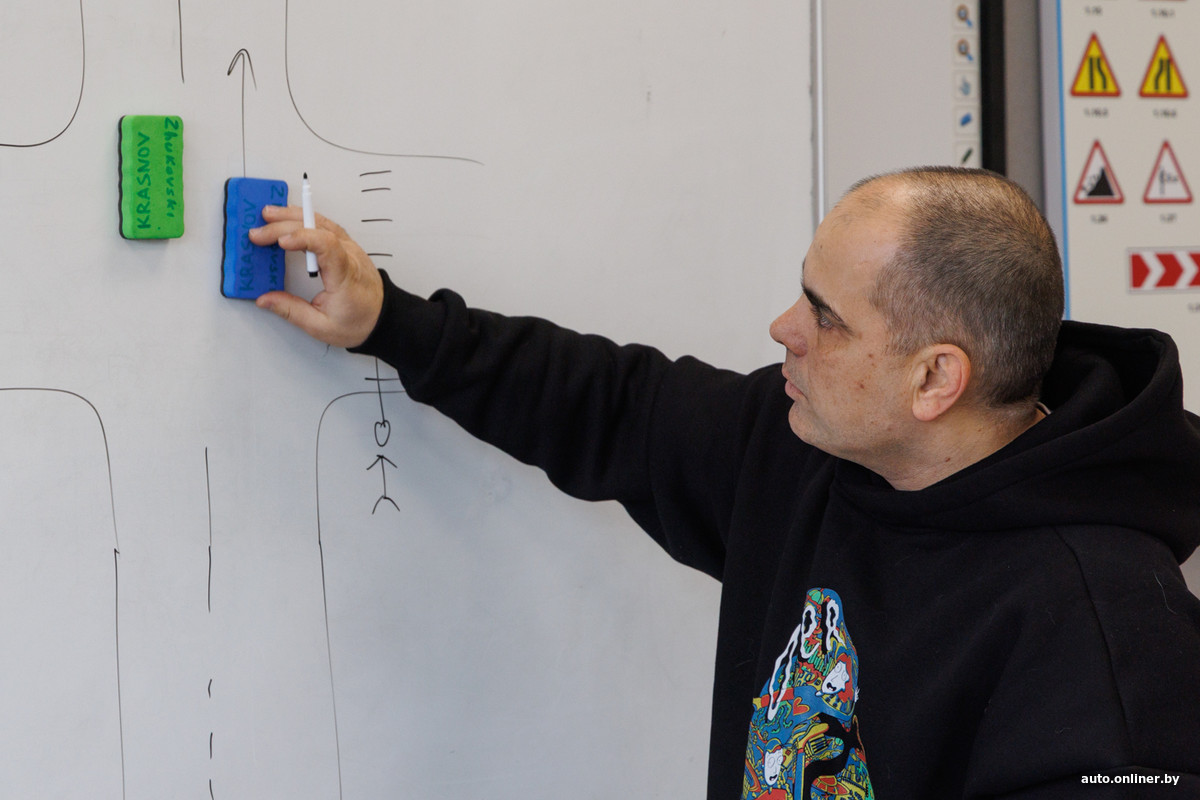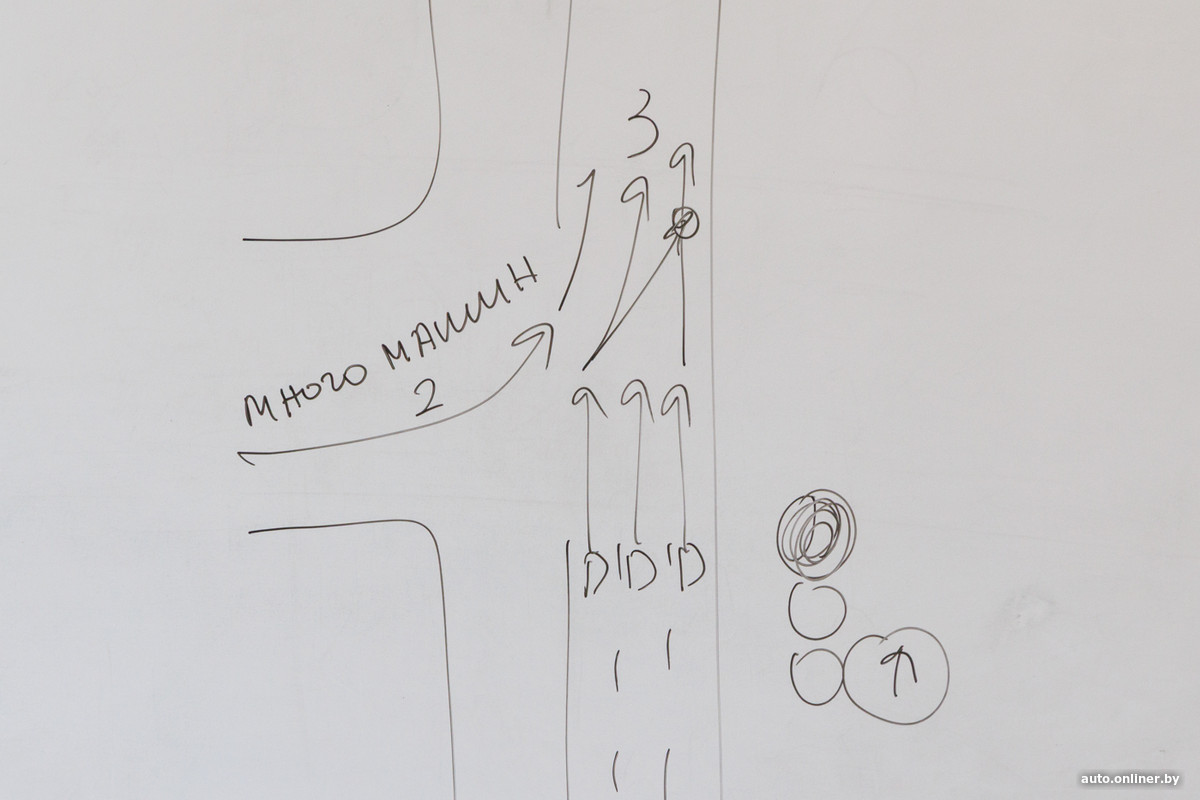 — Я иногда вижу такие ситуации: едет машина, встречный водитель пытается быстрее повернуть налево, чтобы не уступать этой машине. Кто-то пробует даже по встречной срезать. Но в результате, к примеру, он ускоряется, а там пешеходы пошли — и он вынужденно останавливается, оказываясь на пути движения встречного автомобиля. То есть если в него врежутся — он будет виноват в ДТП, — инструктор схематично изображает это на доске.