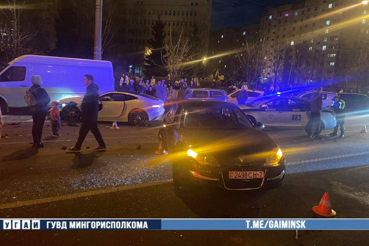 Около 21:00 на улице Кунцевщина в Минске случилось дорожно-транспортное происшествие с участием сразу шести автомобилей. По предварительным данным, 28-летний водитель арендованного автомобиля Jaguar не справился с управлением и протаранил несколько машин.