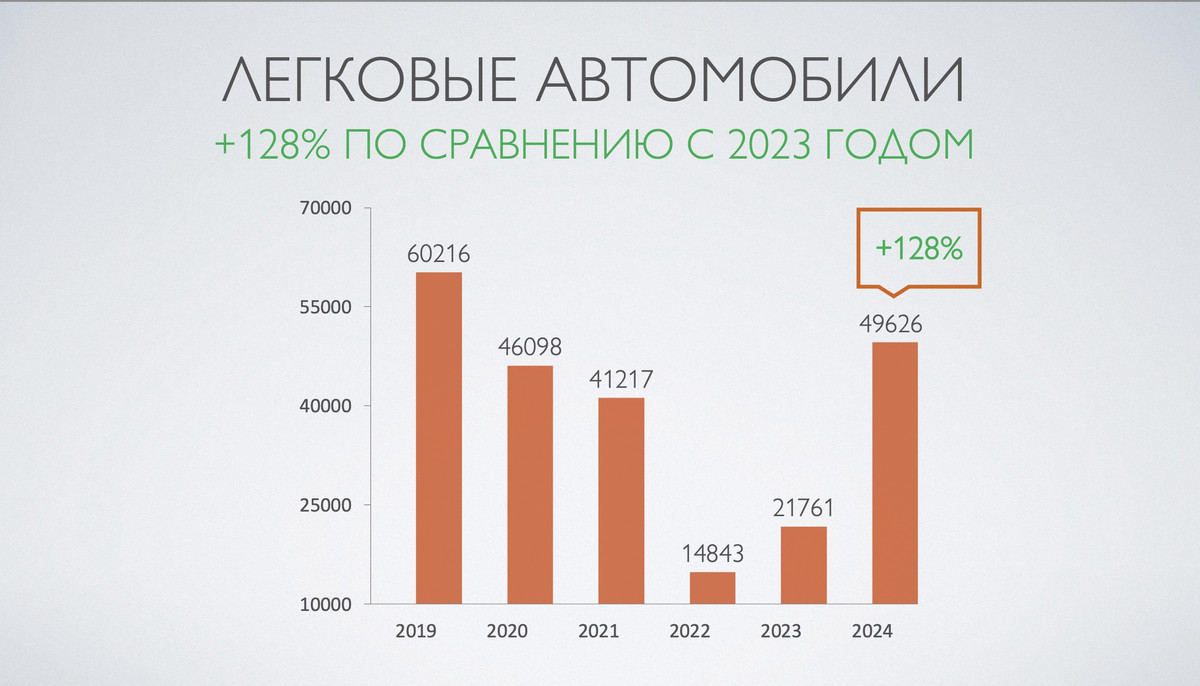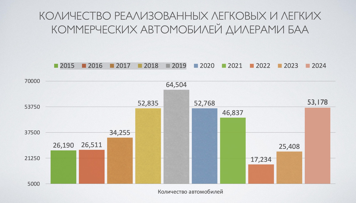 Итак, вот оно: в 2024 году дилеры, являющиеся членами БАА, реализовали 53 178 автомобилей. И это действительно в два раза больше (+109%), чем по итогам 2023-го, когда было продано 25 408 машин. Здесь оговоримся, что данные цифры отражают суммарные продажи легковых автомобилей и легкой коммерческой техники (LCV). До рекорда 2019-го пока далеко.