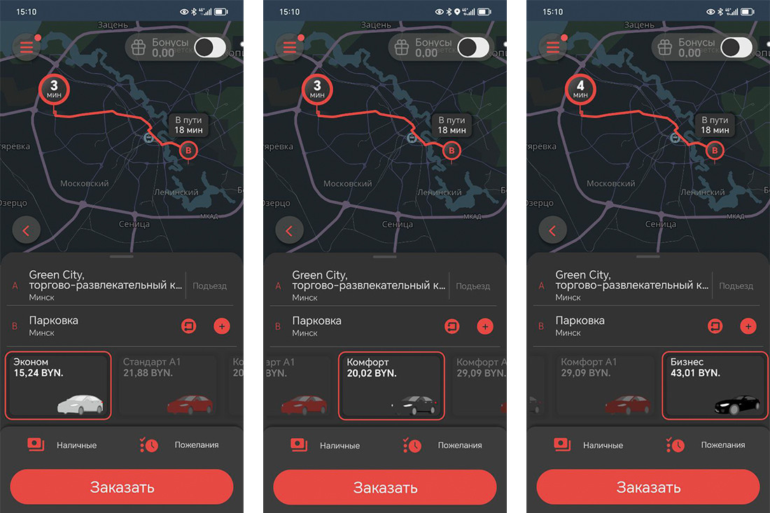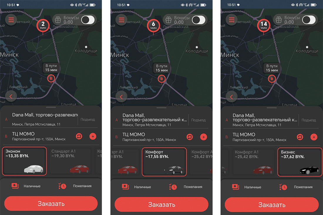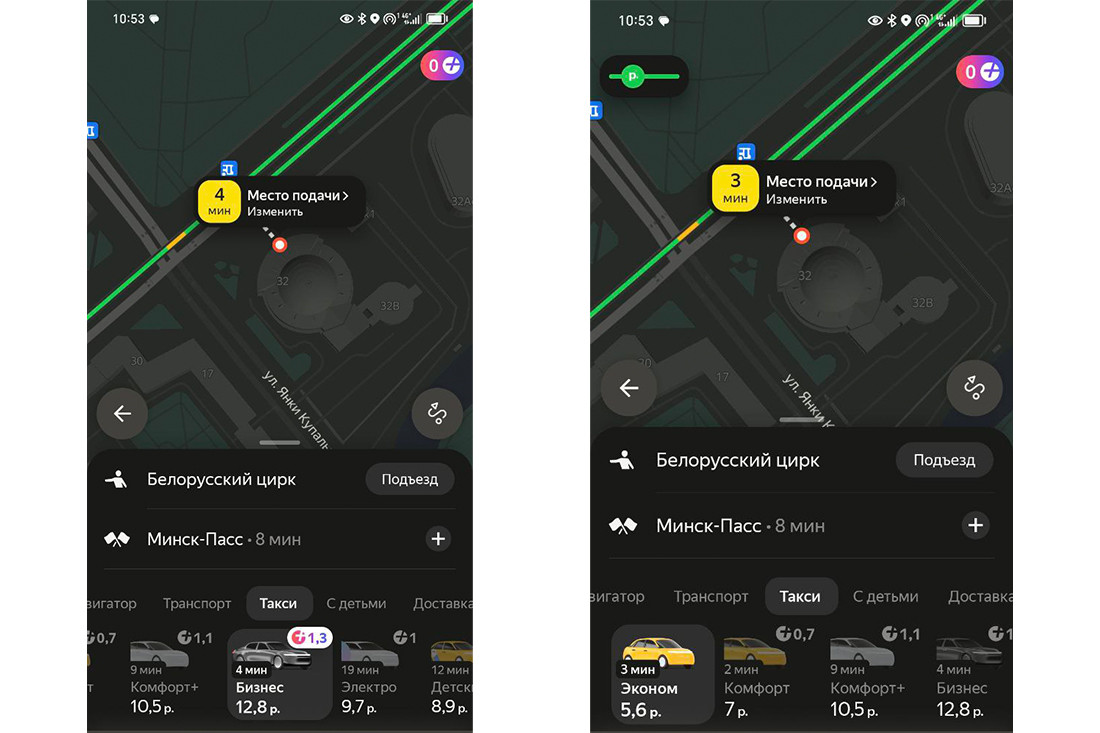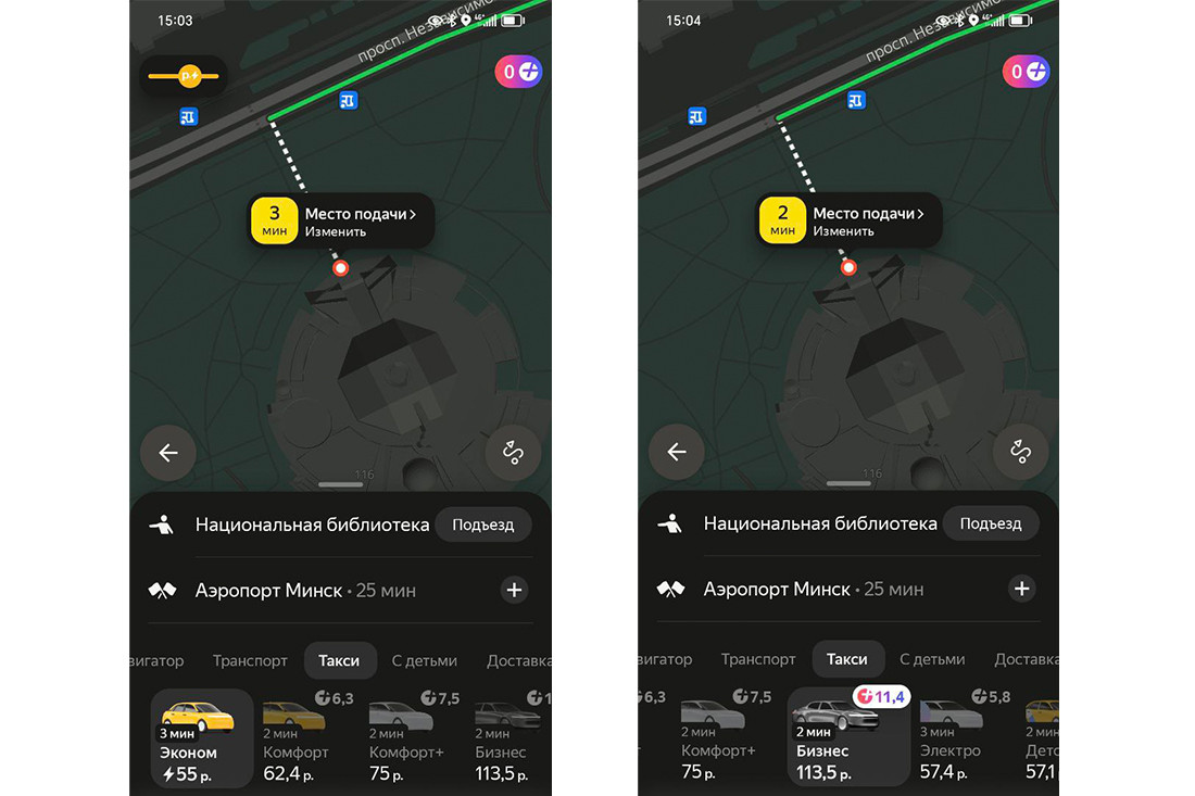 Условная поездка с проспекта Независимости на Партизанский проспект. Расчетное время в пути: 15 минут. Минимальная цена у «Яндекс Go» — 12,4 рубля, но придется подождать около 9 минут. «А1 Такси» готово везти за 13,35 рубля, но обещает подачу машины через 2 минуты.