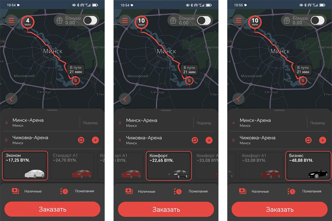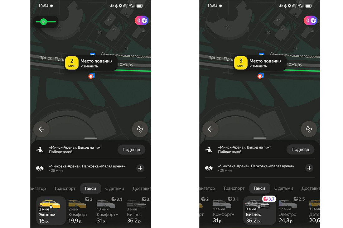 Третий условный маршрут для сравнения, на этот раз длинный, от «Минск-Арены» до «Чижовка-Арены». Занятно, что и в этот раз «А1 Такси» обещает добраться быстрее — за 21 минуту, расчетное время у «Яндекс Go» — 26 минут. И в остальном тенденции схожи с теми, что мы видели на примере предыдущих маршрутов.