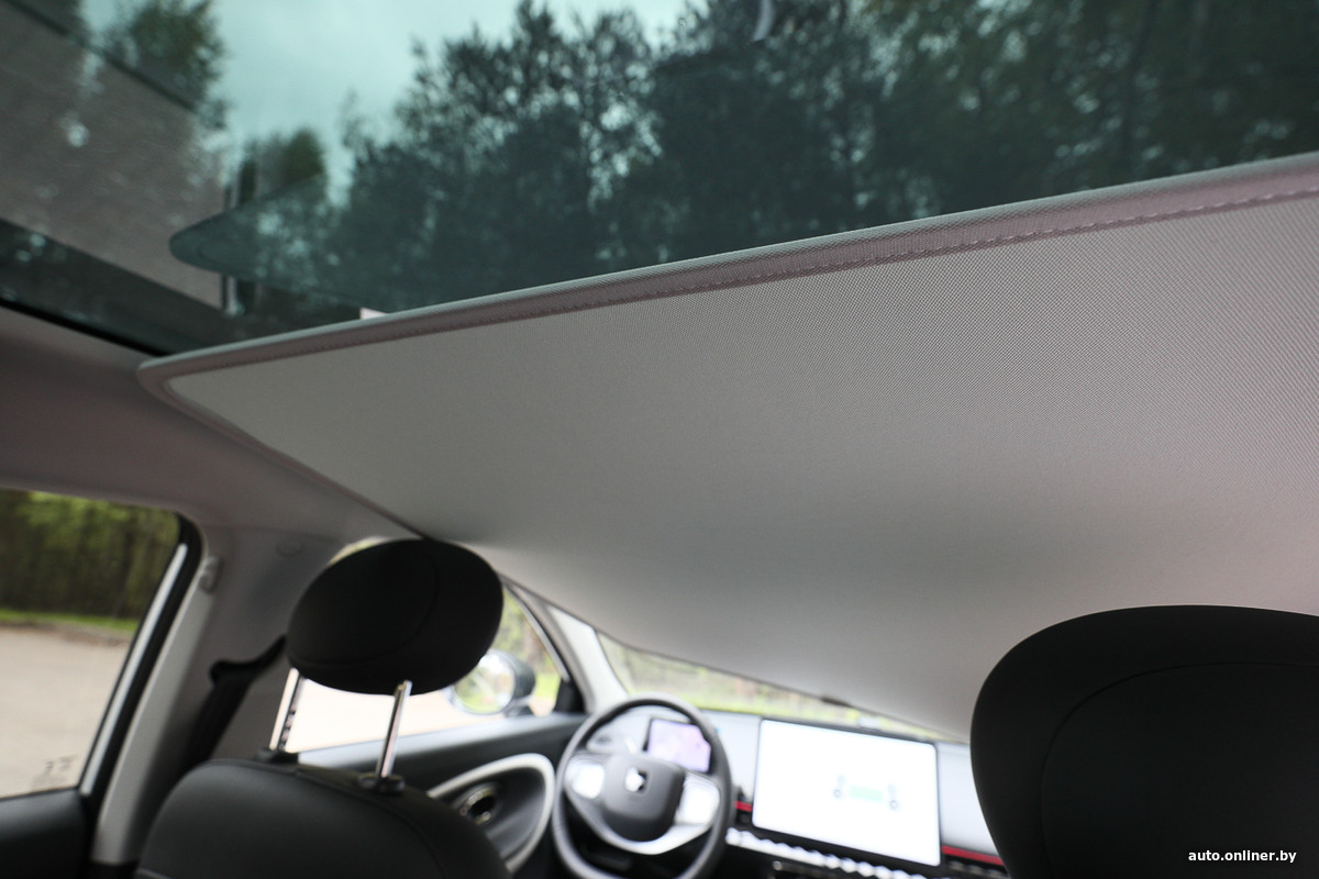 Ба, а крыша-то не черная, а панорамная, с тонированным стеклом почти на всю длину. А шторка имеет два положения: вставлена/вынута. Да-да, именно так: эта легкая конструкция или устанавливается в проем крыши, или вынимается, хитро складывается и пакуется в специальный чехол. Бюджетное решение, но, в принципе, можно обходиться вообще без него: даже в солнечную погоду в салоне не припекало.