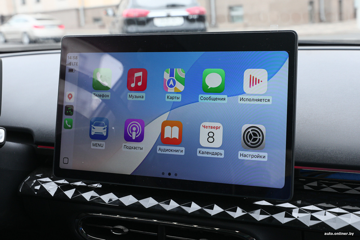 Зато экран мультимедийной системы — диагональю 15,6 дюйма. Он настолько большой, что его частично перекрывает рулевое колесо с места водителя… Зато есть полная русификация (местами забавная по переводу) и протоколы Android Auto и Apple CarPlay. Еще из плюсов — довольно большое количество настроек в хорошо структурированном меню, а также эфирное радио, которое все реже встречается на китайских автомобилях. И, конечно, ночной режим для основного экрана и цифровой приборки.