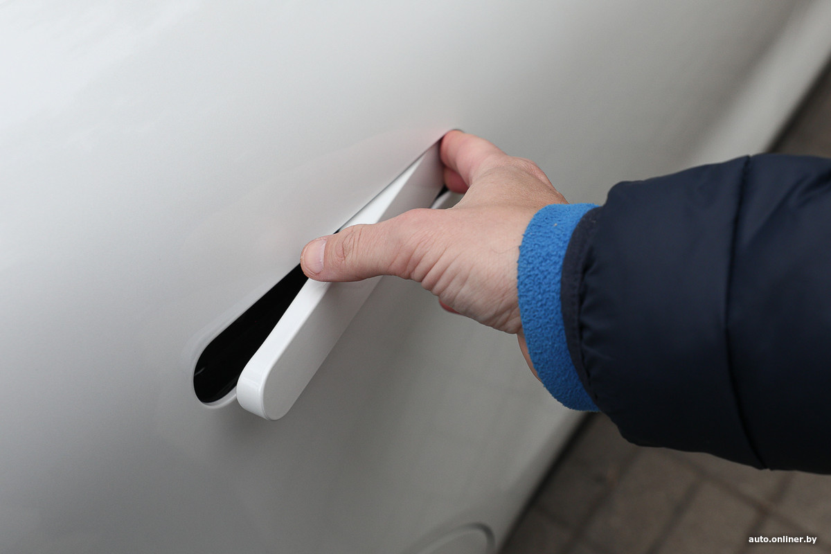 Стоит подойти к автомобилю вплотную, и утопленные ручки выезжают. Но система бесключевого доступа настроена на слишком близкое расстояние: отходишь буквально на метр, чтобы снять пистолет с зарядной колонки, и двери уже закрываются. В определенных ситуациях это напрягает. Впрочем, дальность срабатывания можно регулировать.