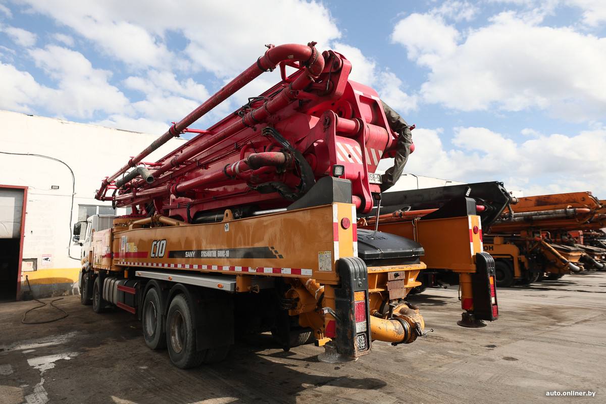 Среди автопарка компании — 20 огромных автобетононасосов, еще две новые машины стоят на таможне. Это специальная техника, перекачивающая прибывающий на стройку бетон непосредственно к месту укладки.
