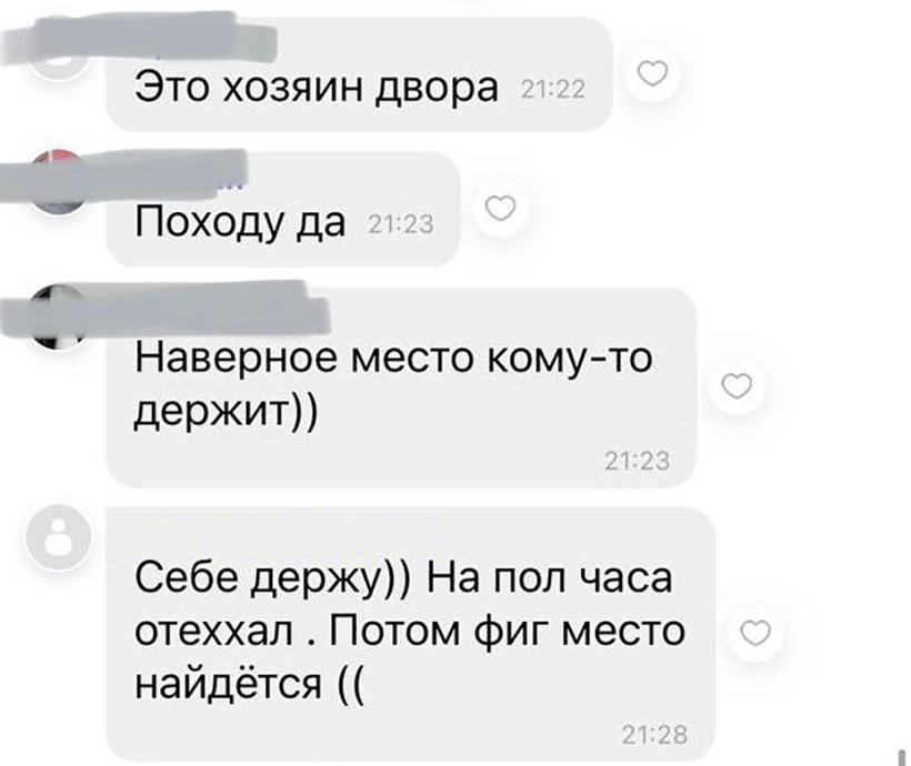 «Наверное, место кому-то держит», — предположил кто-то. На это последовал ответ от другого участника чата: «Себе держу. На полчаса отъехал. Потом фиг место найдется». А как вы относитесь к подобному?