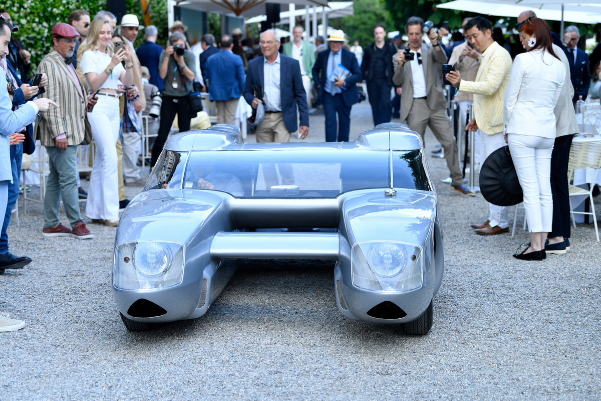 Как в своей тарелке на Комо смотрелась такая вот странного вида «капсула времени», напоминающая катамаран. Это Silver Fox, созданный в единственном экземпляре итальянской компанией OSI в 1967 году с одной целью — принять участие в «24 часах Ле-Мана». Небольшой литровый 4-цилиндровый двигатель Renault Alpine разгонял этот диковинный аппарат массой всего 500 кг до 250 км/ч.