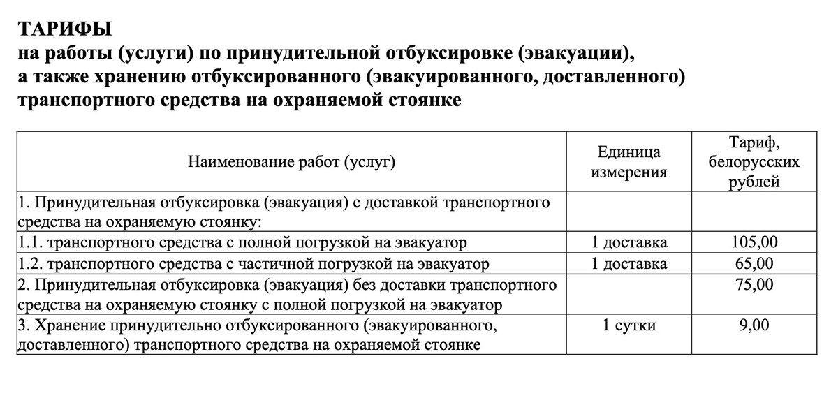 Теперь принудительная отбуксировка (эвакуация) транспортного средства с полной погрузкой на эвакуатор и доставкой на охраняемую стоянку будет стоить 105 рублей, без доставки — 75 рублей. Эвакуация на стоянку с частичной погрузкой обойдется в 65 рублей. Хранение принудительно отбуксированного транспортного средства на охраняемой стоянке будет стоить 9 рублей за одни сутки.