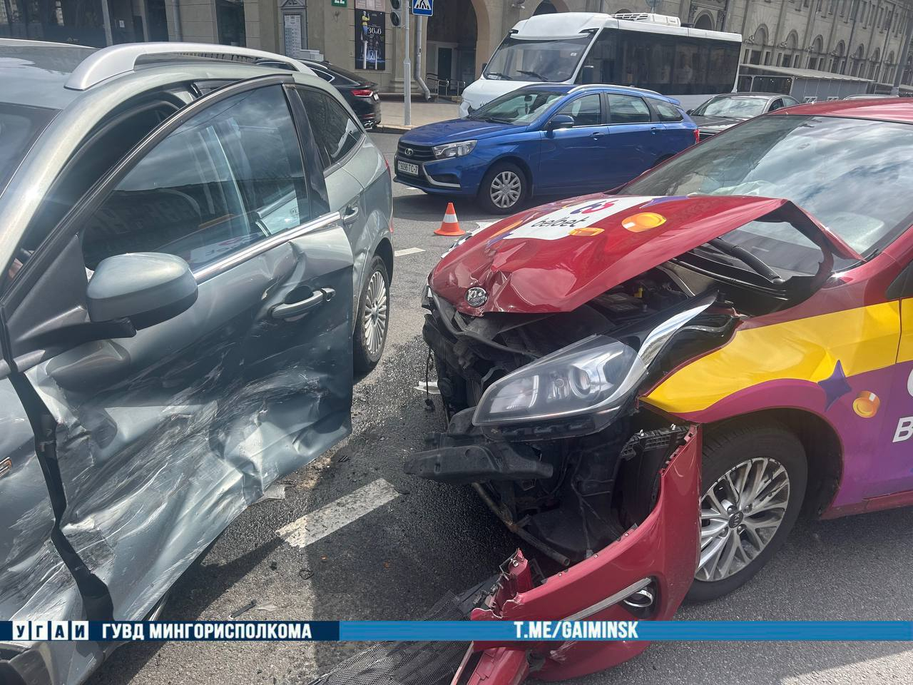 «По предварительной информации, сегодня около 14:40 60-летний водитель автомобиля Ford, двигаясь по проспекту Независимости, выехал на перекресток с улицей Энгельса на запрещающий красный сигнал светофора, в результате чего совершил столкновение с автомобилями Kia и Ford, начинавшими движение через указанный перекресток на разрешающий зеленый сигнал светофора», — сказано в сводке ГАИ.