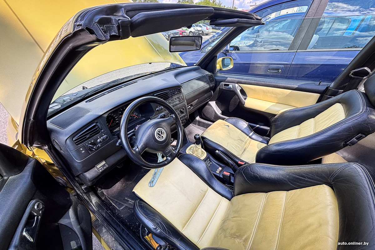 Автомобиль желтый, как и его салон — взгляды прохожих обеспечены. Кузов не без изъяна, да и сидения «уставшие». Зато крыша складывается с помощью электропривода. Просят за автомобиль 1998 года выпуска (2 л, бензин, механика) $5100 по курсу.