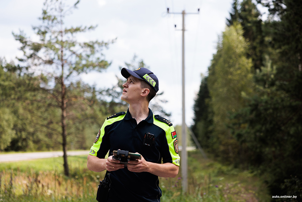 Прыгаем в служебную Tugella и спешим за нарушителем. Он останавливается не сразу, несмотря на включенные маячки, — неужели будет погоня? Но нет: вскоре Toyota уходит на обочину. Мужчина в годах (к слову, он оказался народным артистом Беларуси) смотрит на инспектора с легким удивлением. Сотрудник ГАИ озвучивает, что обгон был зафиксирован с помощью квадрокоптера. Тогда водитель с тоской в глазах признает: «Да, было».