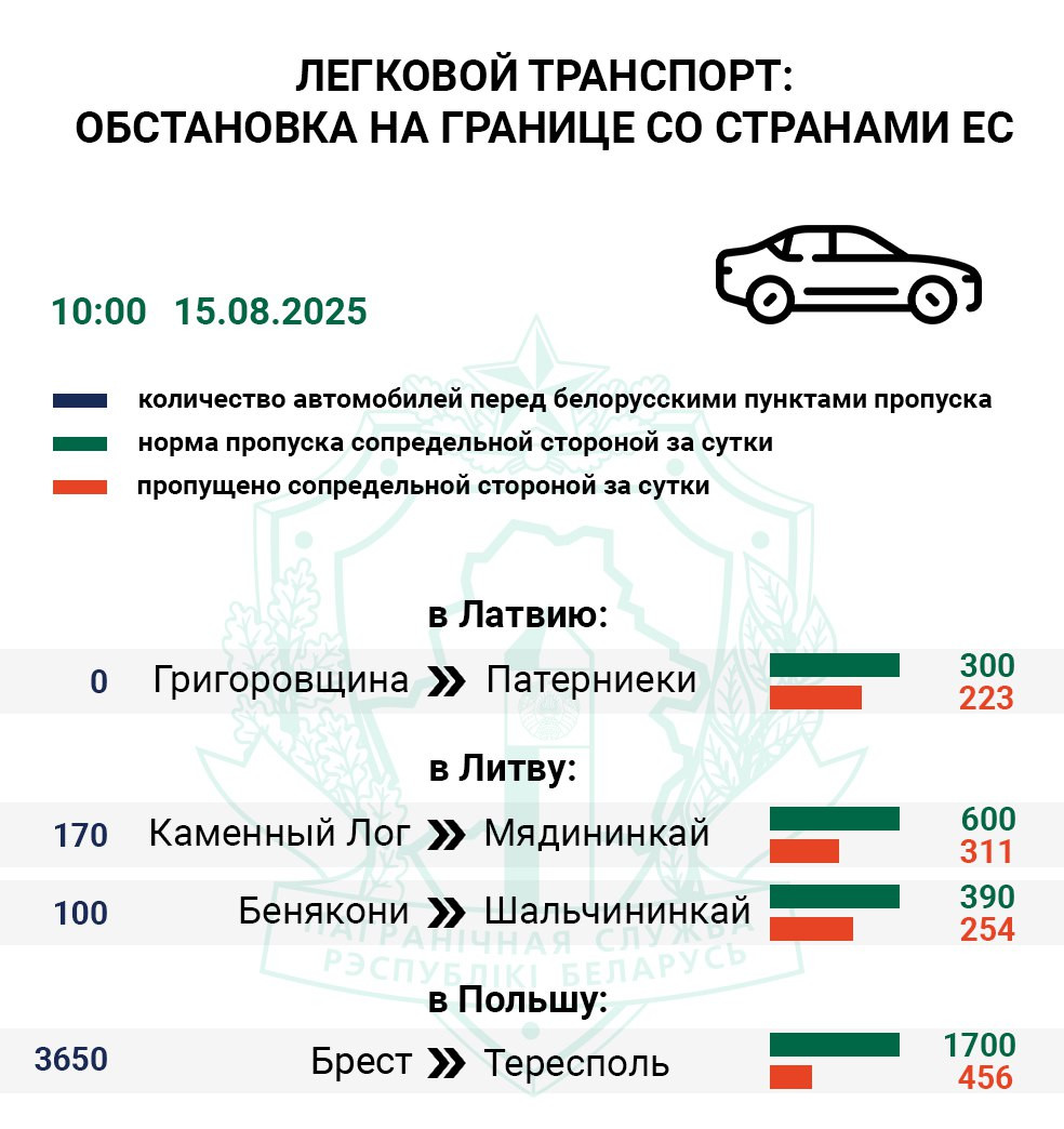 — Перед единственным доступным для легковушек польским пунктом пропуска «Тересполь» («Брест») фиксируется 2470 единиц авто и 55 автобусов. В субботу очередь на въезд в Польшу достигала 2630 легковушек. Сопредельная сторона за два дня приняла на свою территорию 35% авто от нормы, — рассказывали в понедельник в ГПК.