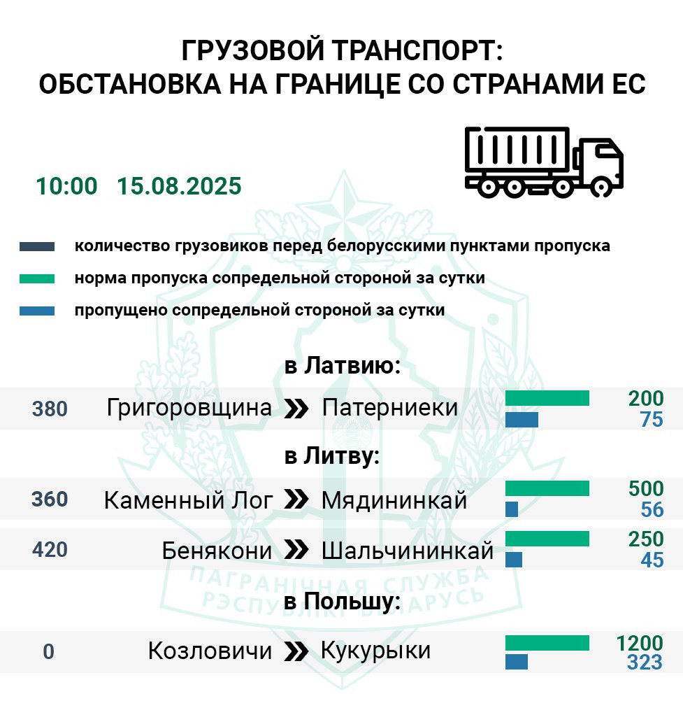 Также по информации пограничников, сотрудники латвийского погранперехода «Патерниеки» («Григоровщина») с пятницы приняли на свою территорию 34% грузовиков от нормы. Въезда в Евросоюз ожидают 500 фур.