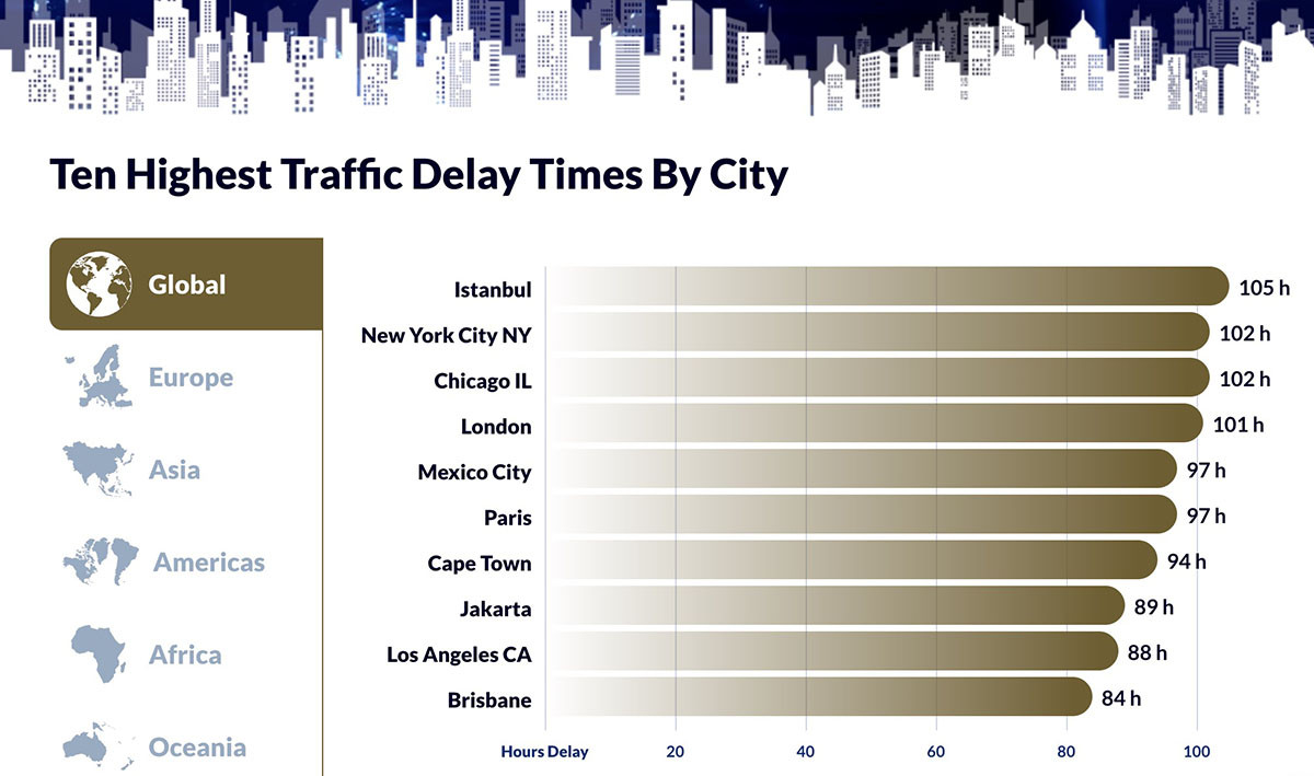 Аналитики компании INRIX ведут подсчет дорожных заторов в разных странах. Итогом этой работы является мировой рейтинг заторов. В его основе лежит понятие времени задержки в пути.