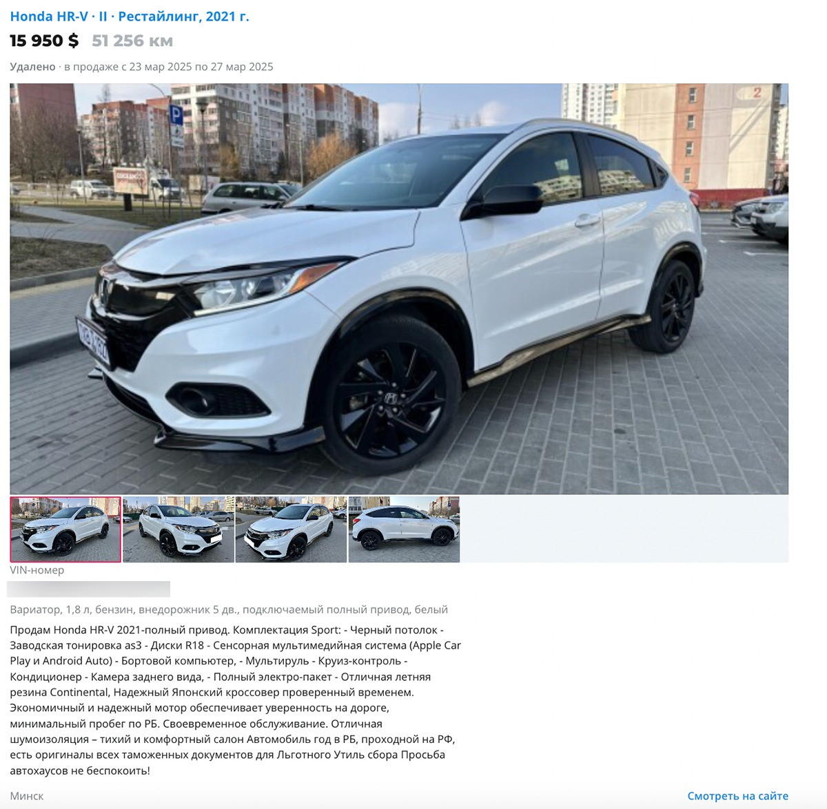 Пробиваем VIN-код Honda через одну из белорусских автобарахолок. И обнаруживаем, что машина «всплыла» на сайте 23 марта по цене ниже рынка — за $15 950. Объявление провисело четыре дня.