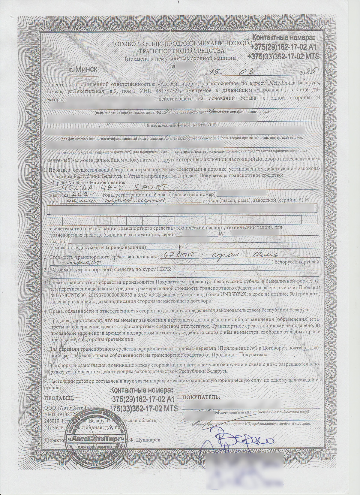 Важный нюанс: тот самый автохаус на ул. Горецкого в документах не фигурирует никак. О его участии мы знаем только со слов Алексея. В бумагах указан гомельский «Автосититорг». И сам Алексей по документам, которые есть у него на руках, в сделке вовсе не участвует. Мужчина предоставил редакции один-единственный договор купли-продажи: «Автосититорг» продает Honda некой девушке по имени Александра. Алексей утверждает, что после сделки ему предоставили только этот документ. И то — копию.