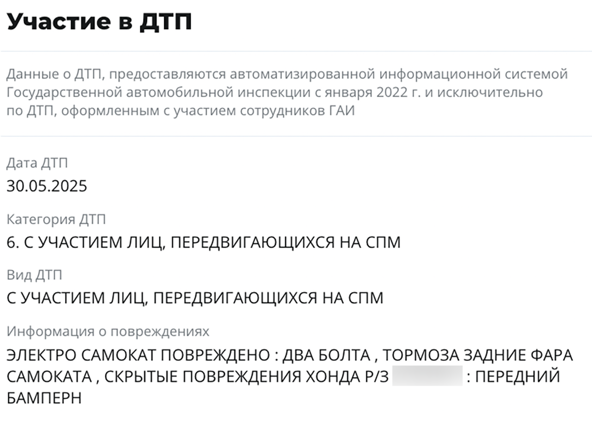 Как следует из отчета по VIN-коду, в мае этого года Civic попал в ДТП. Второй участник аварии — человек на средстве персональной мобильности. Однако, насколько нам известно от нескольких источников (это бывшие друзья нашего «героя»), у Евгения не было прав. Кто же был за рулем Civic? Один из потерпевших озвучил версию, что тот самый Сергей Т.