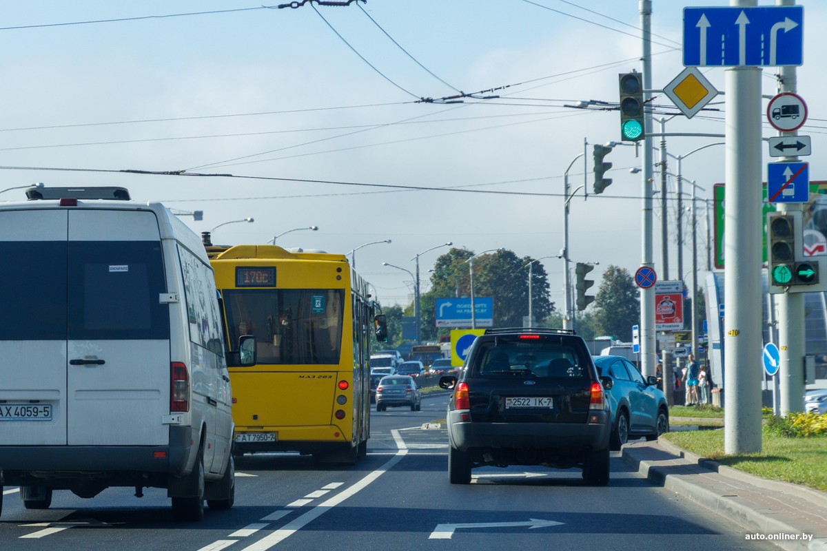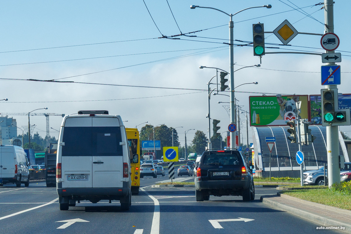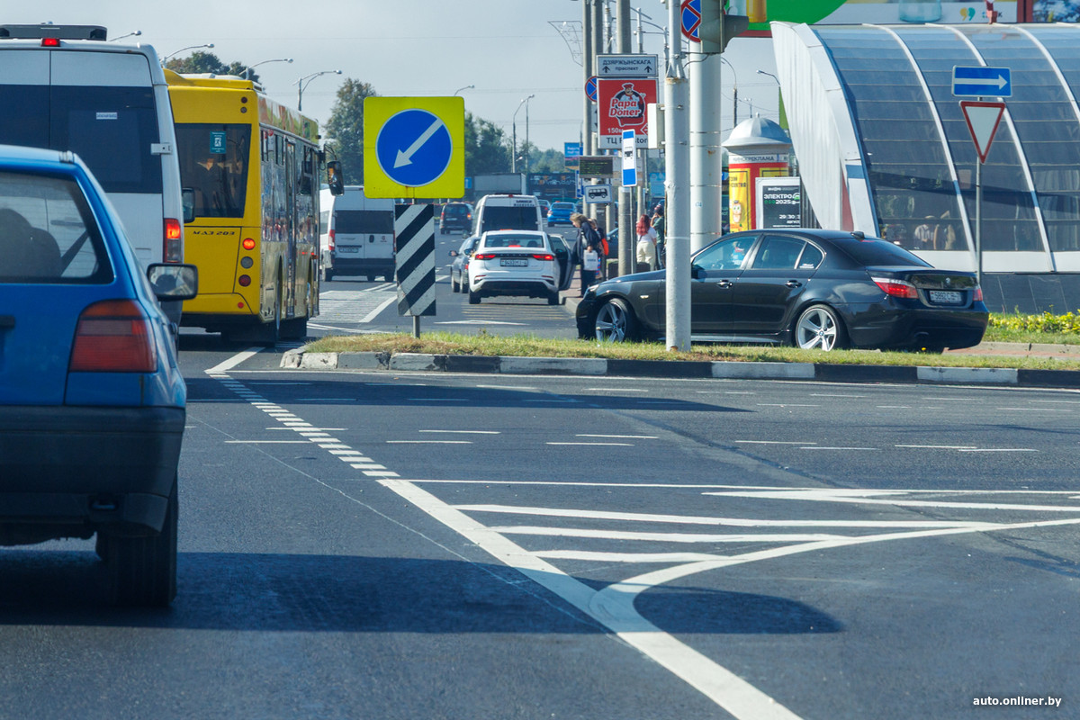 Ориентирование на местности. Пересечение проспекта Дзержинского и улиц Сергея Есенина и Яна Чечота, рядом — станция метро «Малиновка». Перекресток большой, на проспекте к нему выводят по пять полос с каждой стороны, но для движения прямо остается по три: крайние уводят на повороты в свою сторону.