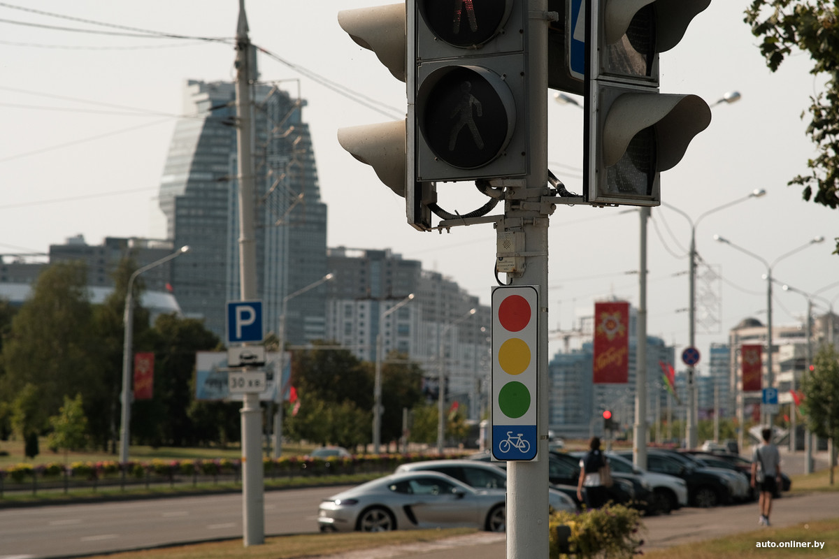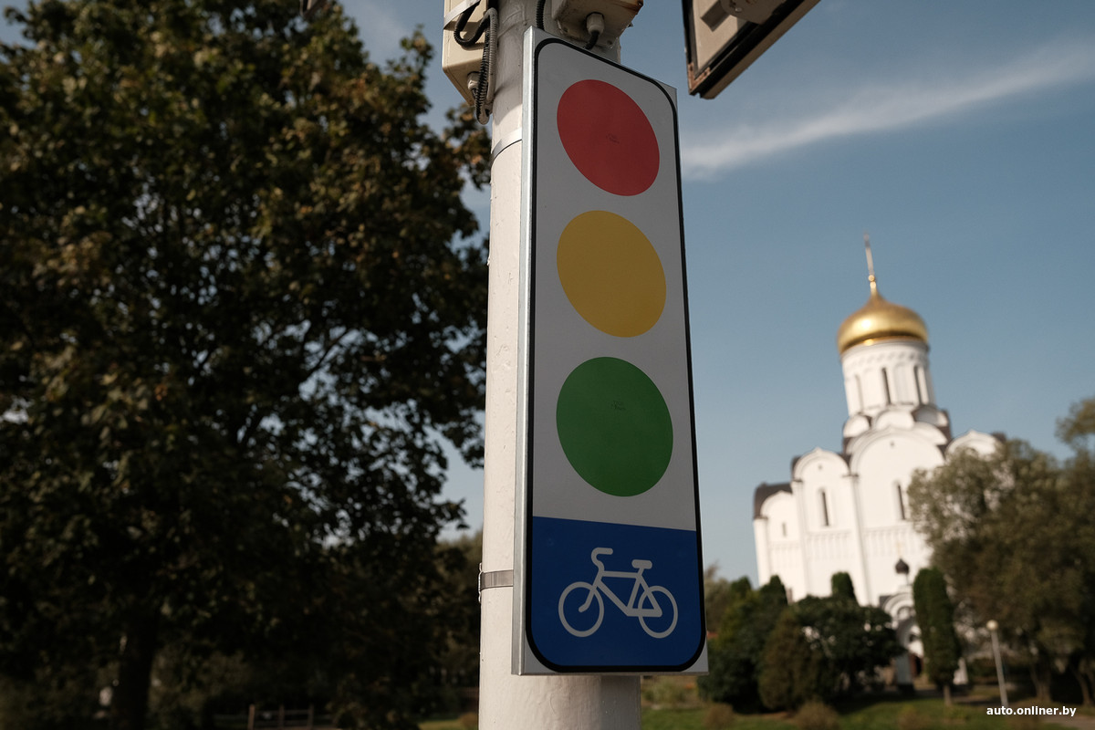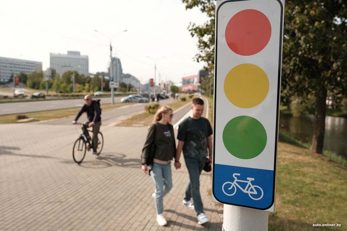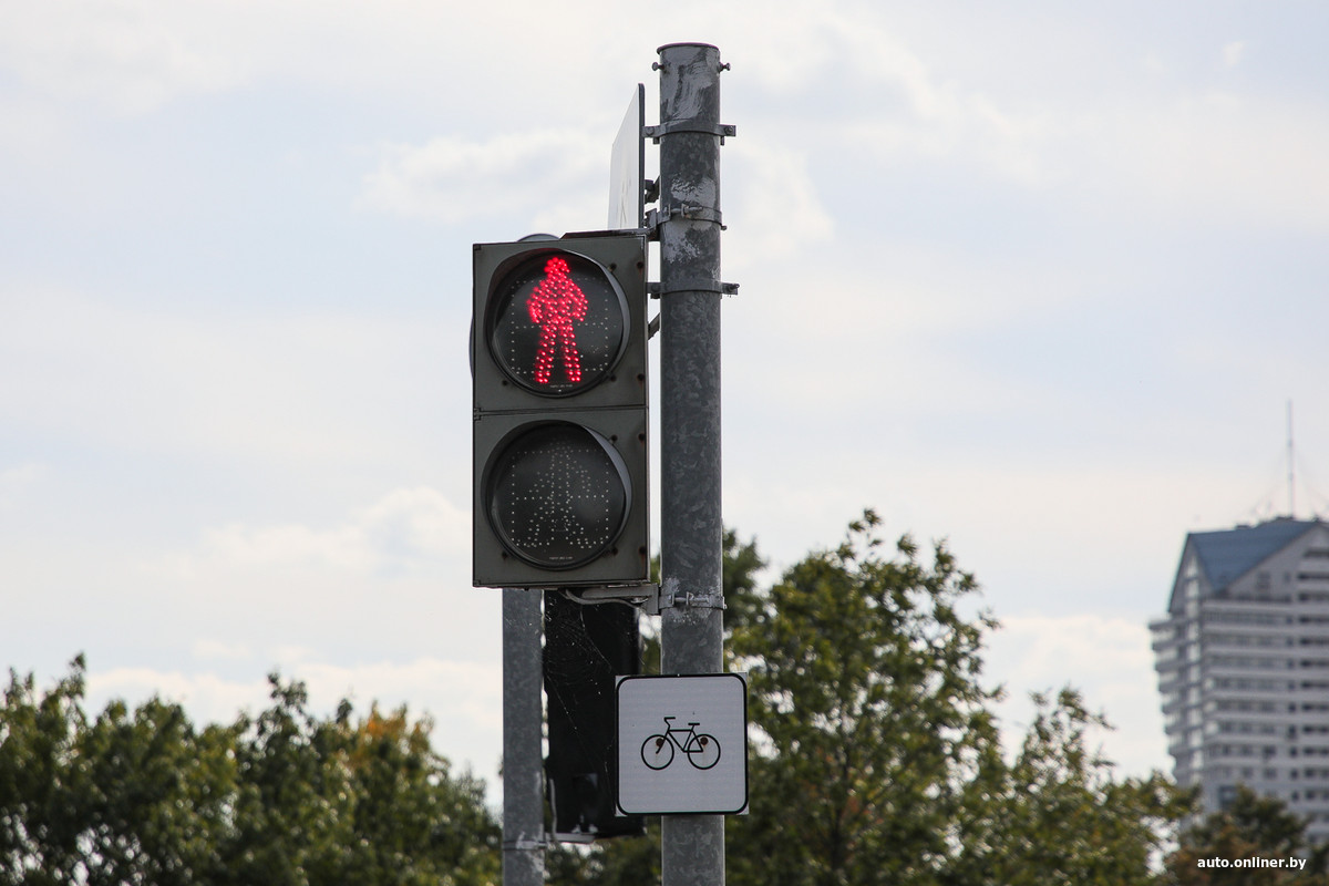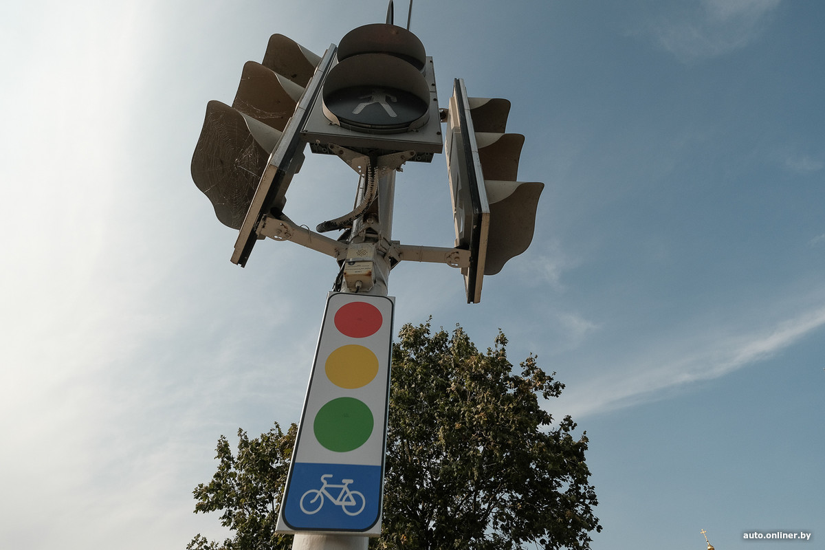 И их становится больше. Устанавливают и таблички, и велосипедные светофоры. К примеру, совсем недавно такой светофор появился на регулируемом пешеходном переходе через проспект Независимости возле Национальной библиотеки. Настолько недавно, что когда мы делали там фотографии, он еще не работал и велосипедисты с недоумением переглядывались: можно не спешиваться или пока еще нельзя?