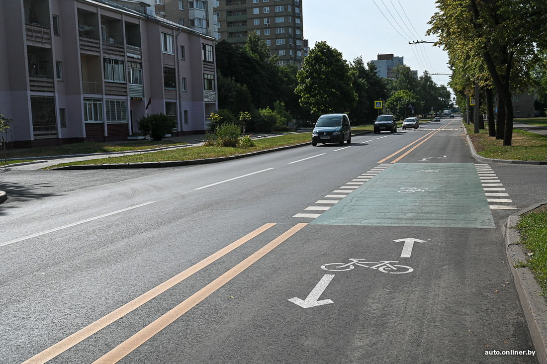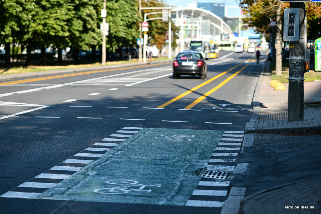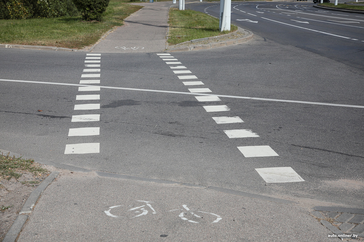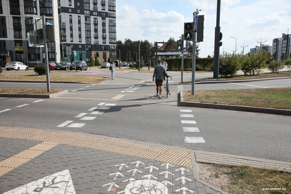 В Минске есть единичные места, когда велосипедный переезд организован через перекресток — в сущности, по проезжей части. Экспериментальная (сколько лет мы еще будем так ее называть?) велодорожка на улице Веры Хоружей, велодорожка на улице Нововиленской.