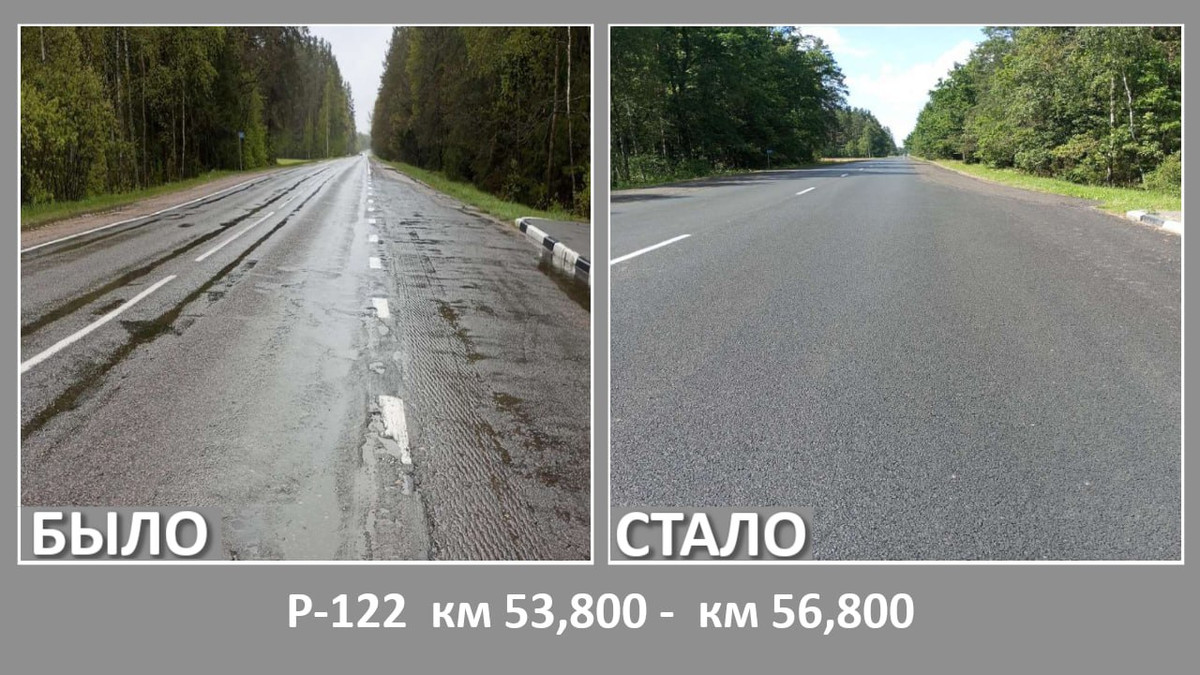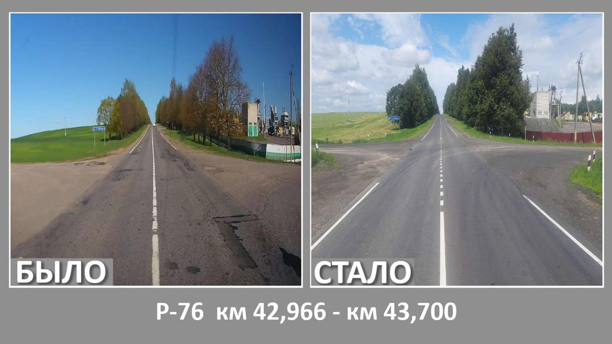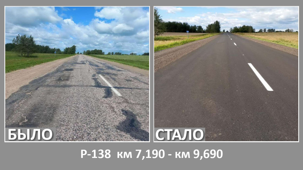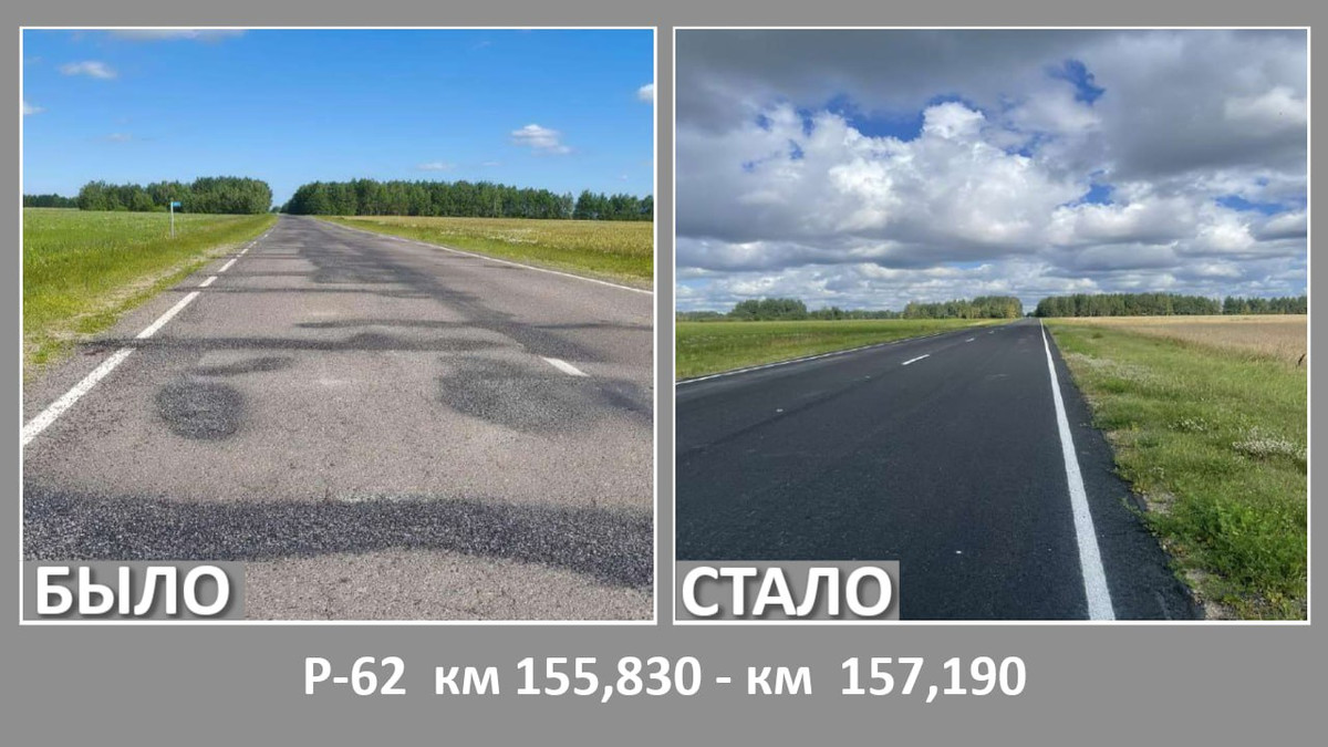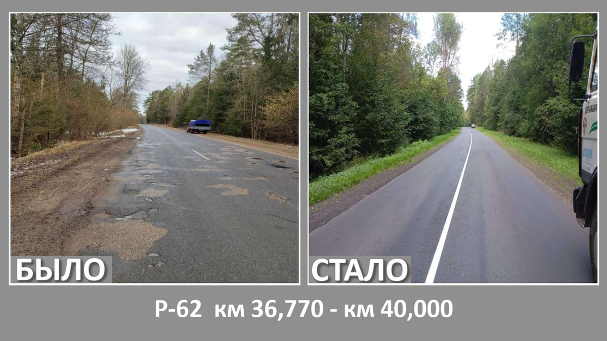 Кроме того, ремонтировалась дорога Р62 (Чашники — Бобр — Бобруйск, через Кличев) — два участка.