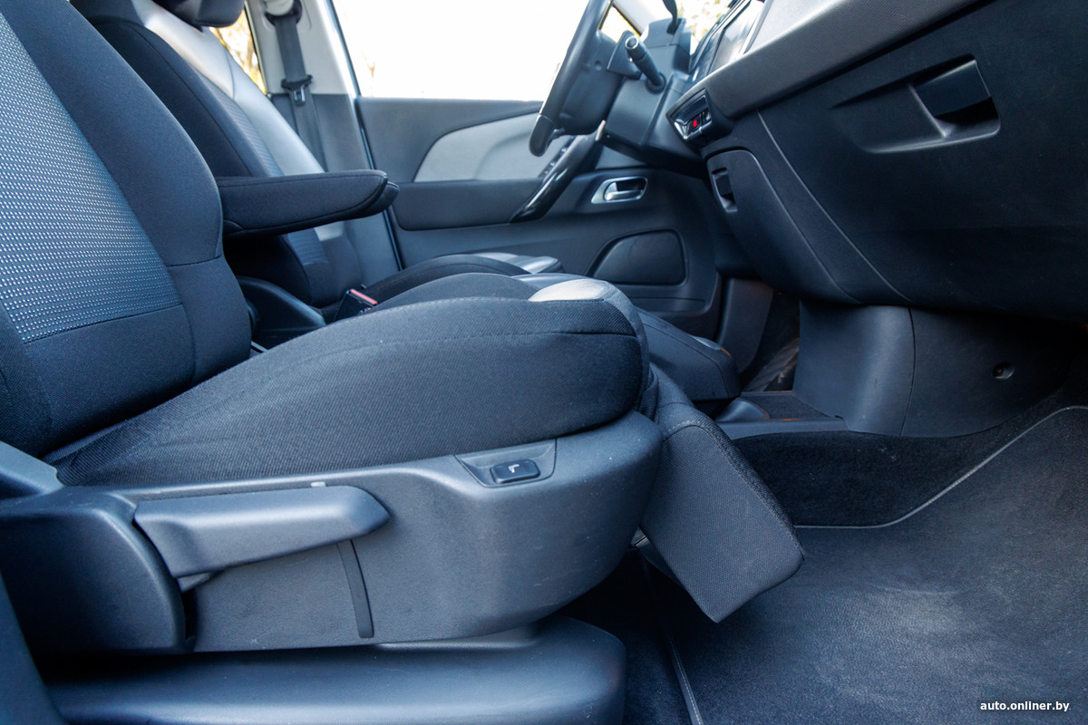 Еще из интересных особенностей оснащения — отдельный обдув в задней части салона, ведь C4 Grand Picasso — 7-местный. Правда, владелец признает, что третий ряд сидений — лишь для детей или для людей ростом до 170 см и в реальной жизни им довелось пользоваться всего раз. Но тем ценнее возможности трансформации: если эти стульчики не нужны, они просто складываются в ровный пол багажника, не занимая лишнего пространства.