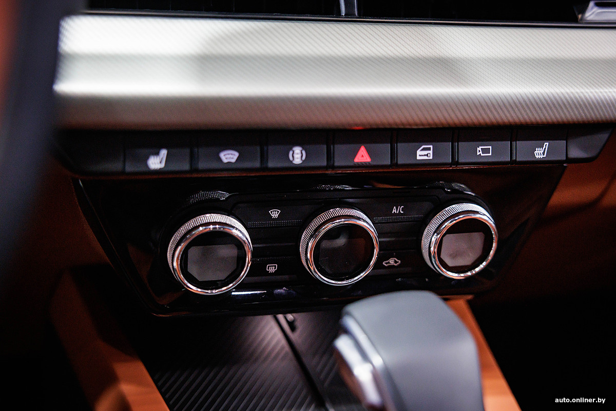 Удалось заглянуть и в ярко-рыжий салон. Там нашлись два экрана (левый выполняет роль цифровой приборки, а правый отвечает за мультимедиа). При этом блок управления климат-контролем с тремя кругляшами-регуляторами решен в стиле Vesta.