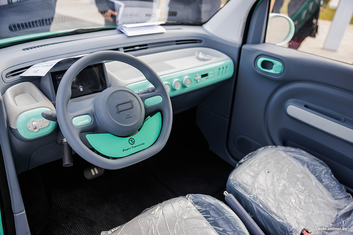 Нас удивило наличие у «экспоната» подрулевого лепестка в нижней части баранки и странного рычага слева от него. Когда мы подошли к Xiaoma, выставленной в помещении, нам объяснили, что это ручное управление. Обе машинки оборудованы для людей с инвалидностью.
