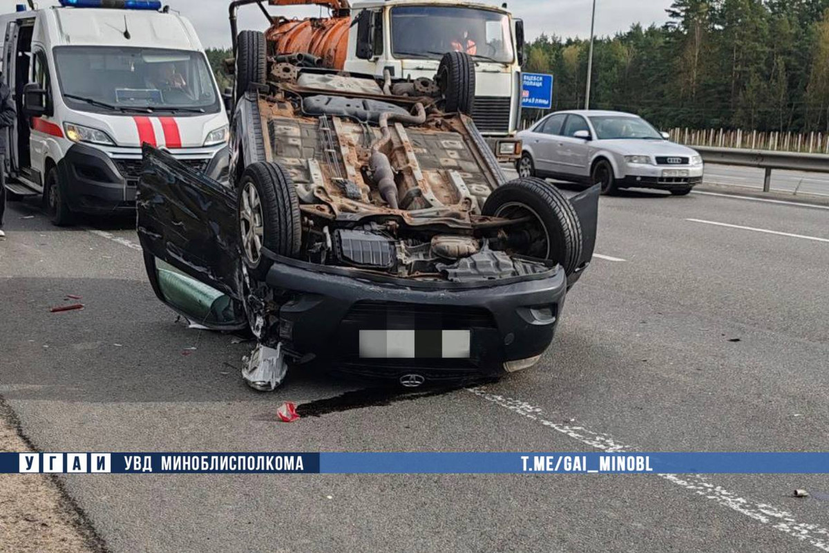По данным ГАИ, в 09:55 34-летний водитель DAF с полуприцепом Schmitz двигался в крайней левой полосе движения в направлении Минска. Он попытался перестроиться в крайнюю правую полосу, но в итоге столкнулся с Toyota, за рулем которой была 46-летняя женщина. В результате столкновения легковой автомобиль опрокинулся, водитель Toyota получила незначительные травмы. Сообщается, что рядом с ней находился 17-летний сын, которому удалось избежать травм.