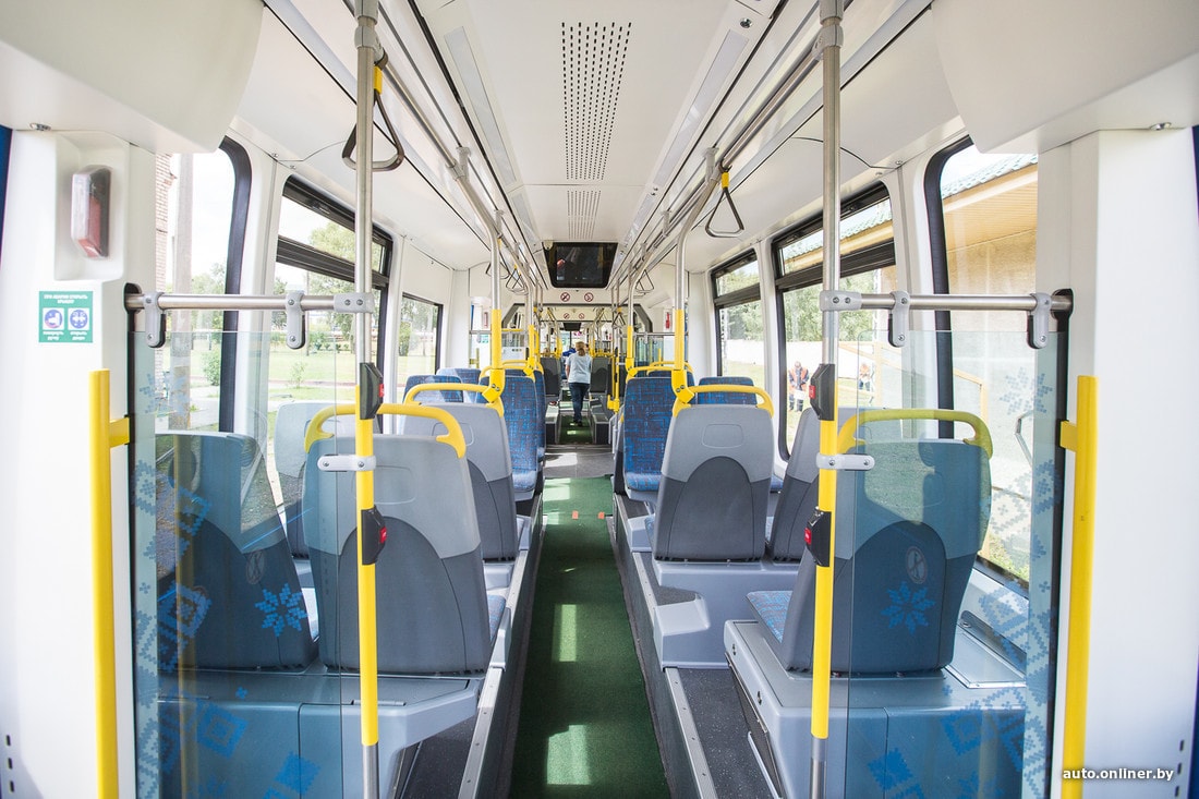Следующим шагом к низкопольности от отечественного производителя стал вагон модели 84300М. Пол здесь тоже переменный, но низкий — на 80%. Уже нет поручней на входе, напротив входных дверей есть накопительные площадки, ступенек тоже нет. То есть это первый минский трамвай, в который можно вкатить детскую коляску без посторонней помощи.