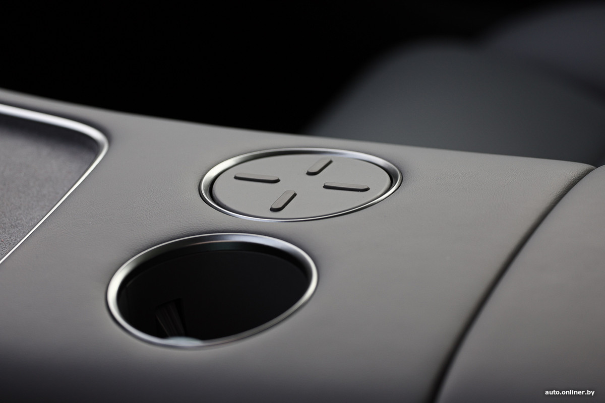 Набор для задних пассажиров, конечно, скромнее: никакого терморегулирования дивана не предусмотрено, за микроклимат отвечают дополнительные воздуховоды без индивидуального блока управления, а из дополнительных удобств есть лишь одна USB-розетка да открытые подстаканники в заднем подлокотнике.