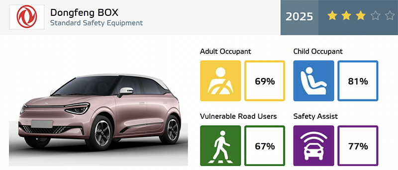 Но при этом Dongfeng Box обеспечил хорошую защиту «всех критических зон тела» в боковом столкновении и набрал максимальное количество баллов. Испытания передних сидений и подголовников продемонстрировали хорошую защиту от хлыстовых травм при столкновении сзади. В отчете отмечают: автомобиль оснащен усовершенствованной системой eCall, которая оповещает экстренные службы в случае аварии, а также системой предотвращения повторных столкновений. Dongfeng продемонстрировал, что двери будут открываться в случае затопления автомобиля.