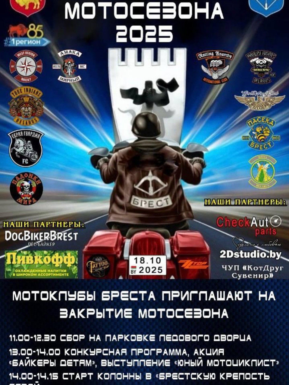 Закрытие мотосезона теперь проводится в разных городах (Брест, Калинковичи, Мозырь, Бобруйск, Лида). Удобно: можно найти ближайшее место для себя и своих друзей. Подробнее по ссылке.