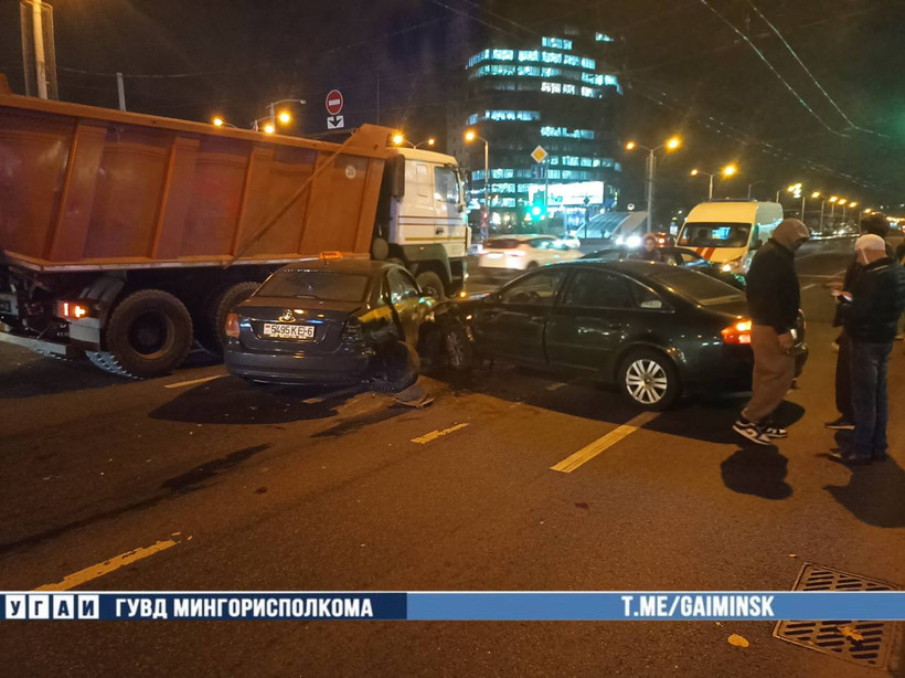 — 51-летний водитель автомобиля Audi, двигаясь по проспекту Дзержинского, по предварительной информации, столкнулся с движущимся в попутном направлении автомобилем Nissan, после чего продолжил движение и столкнулся с остановившимися на красный сигнал светофора автомобилями Volkswagen, МАЗ и Dongfeng, — комментирует ситуацию ГАИ Минска.