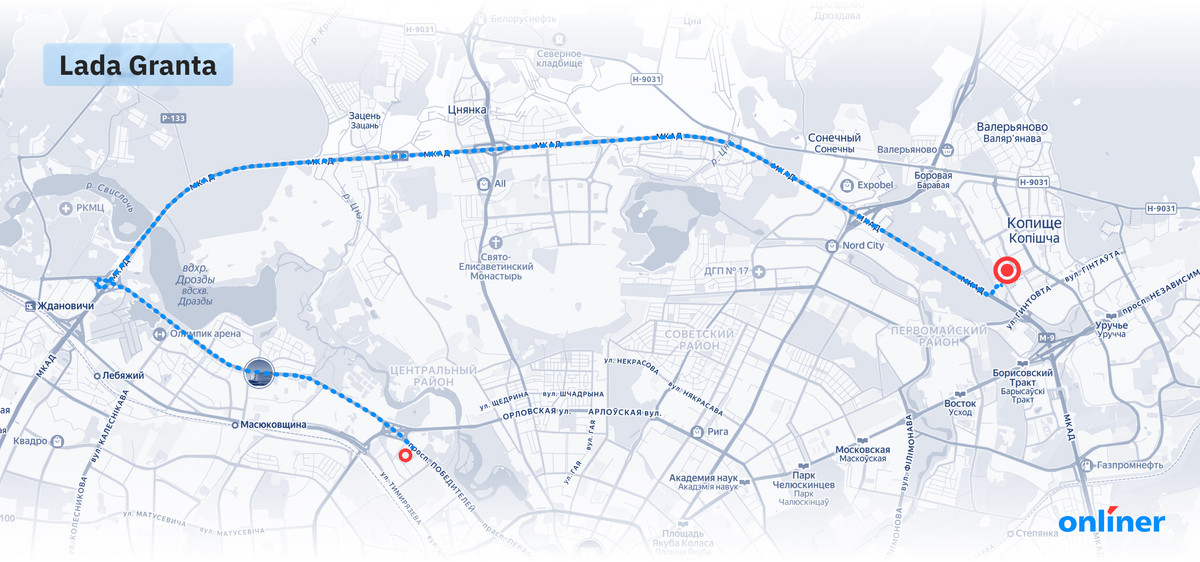 — Через МКАД и пр. Победителей — это самый длинный маршрут, с пассажиром я бы так не поехал, — с ходу заявляет Игорь. — Выбрал его только потому, что целью эксперимента было как можно быстрее добраться до «Замка». С пассажиром я бы поехал по более короткому пути: по пр. Независимости до трамвайных путей, а затем по пр. Машерова и возле стелы направо, на пр. Победителей (к слову, этот маршрут навигатор не предлагал. — Прим. Onlíner).
