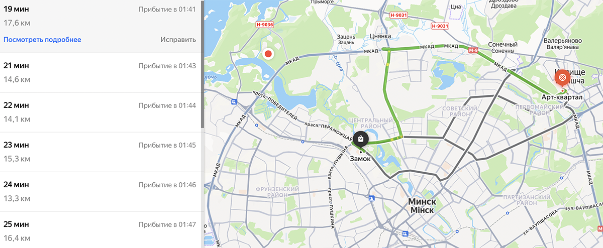 Объявляем точку Б — ТЦ «Замок». Туда нашим героям нужно добраться как можно быстрее. Но, естественно, соблюдая ПДД. Маршрут, казалось бы, простой для любого минчанина, однако навигатор подсказывает сразу несколько вариантов развития событий. Причем разные в разное время. Уже во время написания этого текста он выдал аж шесть маршрутов на выбор. По расчетам навигатора, самый быстрый путь — тот, который самый длинный по километражу. А (почти) самый короткий — самый долгий по времени. Угадаете, какой маршрут «выиграл»?