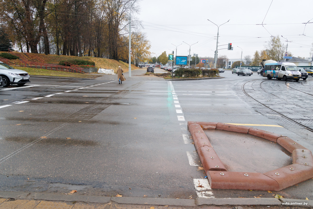 По велодорожке с удобством проезжаем небольшой подъем в районе Дома Москвы и спускаемся к проспекту Машерова. Важно не разгоняться чрезмерно, потому как внизу велодорожка обрывается на пешеходном переходе, выезд на перекресток предусмотрительно блокирован конструктивно. Дальше — через пешеходные переходы (придется спешиваться): налево — вдоль проспекта Машерова к проспекту Победителей, направо — к улице Богдановича или прямо — по улице Даумана в направлении второго транспортного кольца.